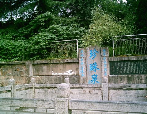 进去左拐几步,就到了一个用石块砌成的方池,方池不大,也就两米见方的样子,凭栏杆下看,半米深清澈见底的泉水,这里就是“珍珠泉”的泉眼,从这满溢出的泉水经暗道在远处一石刻龙嘴中喷涌而出,水势甚响,管理员介绍说是60吨/小时流量,昼夜不息。 池底的泉水是合着气泡上涌的,气泡一串串出现,大小不一,在池中或左或右,或近或远,或连续或略停。上升速度缓且稳定,到了水面气泡才会碎裂。每个大小不一的气泡,略成扁圆,在缓和的上升途中还会左右、前后的上下摆动,显着略不透明的银白色.。我们静静地看了许久,在我印象中应数这眼古泉最为好看、最耐看、也是看得最久的一次。