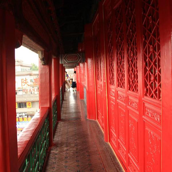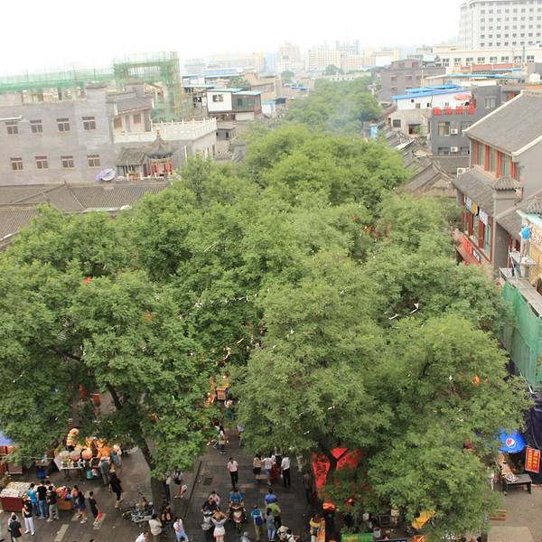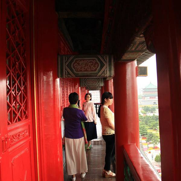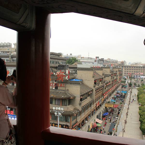 二楼阳台走廊可以对望钟楼,也可俯视回民街。风景还是很不错的~