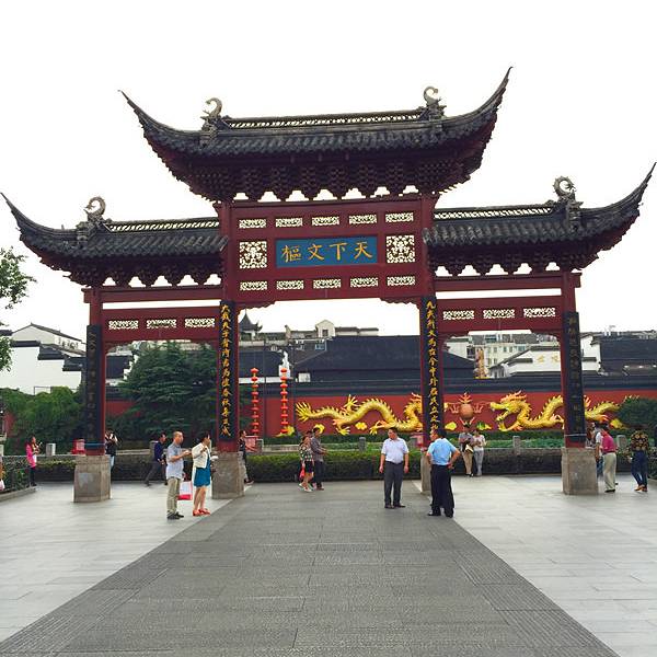 夫子庙的正门正对着牌坊,牌坊下就是南京的秦淮河,一座石桥横跨河上,这里是取经拍照秦淮河景的好地方,河对岸的墙壁上有双龙戏珠,这是在北京以外很少看到的雕龙影壁。