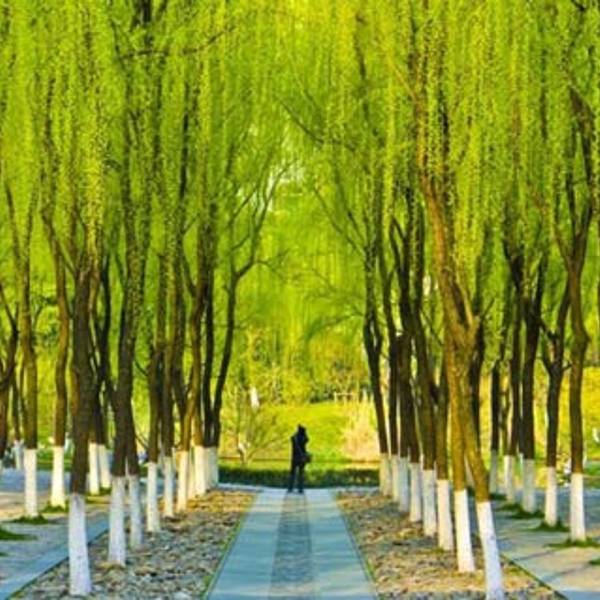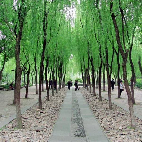 西湖的垂柳品种,来源于天津北仓苗木基地,属于稀有品种节节垂,如少女低垂想着心事的叫垂柳;风中飘动似贵妃醉酒的称“醉柳”;枝叶繁茂如狮头的称“狮柳”;远眺像少女浣纱的称“浣纱柳”。