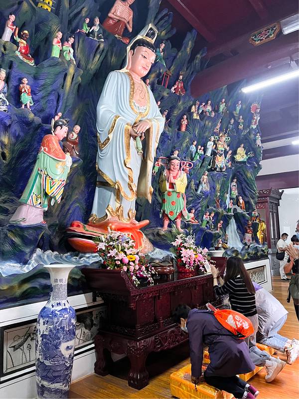 第三进是大雄宝殿,殿内供奉横三世佛,居中为释迦牟尼佛,两侧是阿弥陀佛和药师佛。两侧还供奉金身十八罗汉。大雄宝殿三世佛的背面,是立体彩绘的南海观音菩萨,以及落珈山的一众大罗金仙。