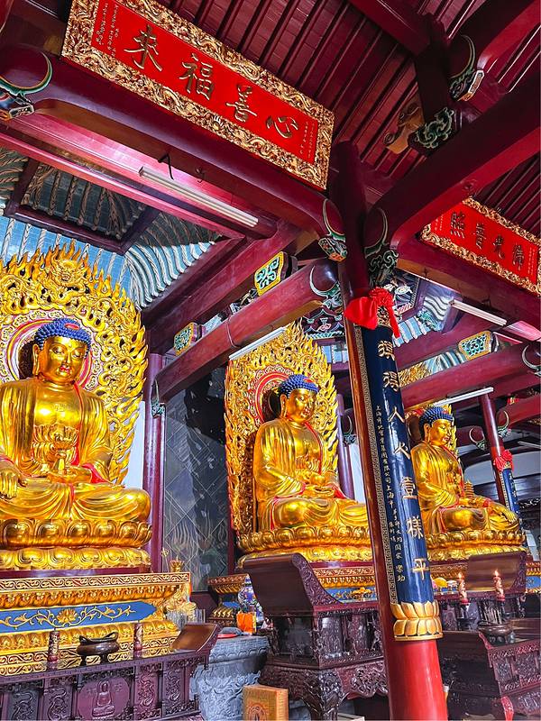 🍀寺廟主體建築沿中軸線排布,共四進,由南到北依次為靈官殿、天王殿、大雄寶殿、藏經樓,前三進為清代建築,最後一進為明朝建築。最漂亮的要屬大雄寶殿,窗戶上雕著花,門楣刻有冰紋,在恰到好處的位置鎏著金,進入大殿一定要抬頭看屋頂,藻井上彩色的「九龍戲珠」雕飾為藝術珍品。我等諸宮殿,