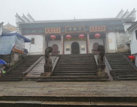 化城寺位于池州市东南50公里处的佛教胜地九华山上,早在东晋隆安五年(公元401年)已有僧人在此筑庵,唐至德初年(公元756年)建寺,被认为是地藏菩萨转世的新罗国(韩国)王子金乔觉(金地藏)在此传经布道。化城寺是九华山的开山祖寺,历史悠久,同时也是地藏菩萨道场。化城寺在山上的食宿大本营九华街的中心位置,由九华街步行到达非常方便。寺庙两旁是一家挨着一家的小商铺,门前的月牙池据说是地藏的放生池,白墙黑瓦的寺庙和商铺倒映在池子里,能拍出漂亮的照片。月牙池附近有一娘娘塔,仅剩塔基,据说是为纪念金地藏的母亲而建。寺庙主体建筑沿中轴线排布,共四进,由南到北依次为灵官殿、天王殿、大雄宝殿、藏经楼,前三进为清代建筑,后一进为明朝建筑。漂亮的要属大雄宝殿,窗户上雕着花,门楣刻有冰纹,在恰到好处的位置鎏着金,进入大殿一定要抬头看屋顶,藻井上彩色的“九龙戏珠”雕饰为艺术珍品。作为九华山历史文物馆,化城寺的庭院回廊中挂着一幅幅展示九华山山水的字画,陈列着文物。值得一看的精品有:明代无瑕和尚用针刺破舌头,笔沾舌血写成的《华严血经》,无瑕和尚的肉身则在百岁宫可以看到;金地藏穿过的巨大的鞋子和帽子;明代青铜谛听,谛听是金地藏的坐骑;清康熙、乾隆帝的御书手迹等。