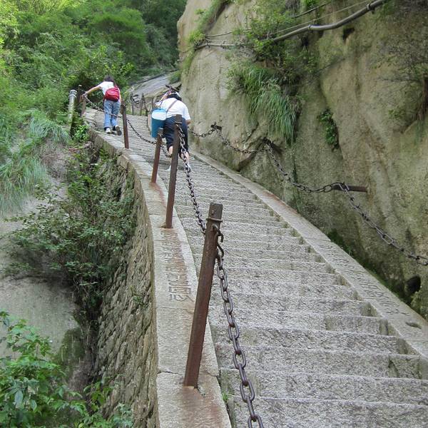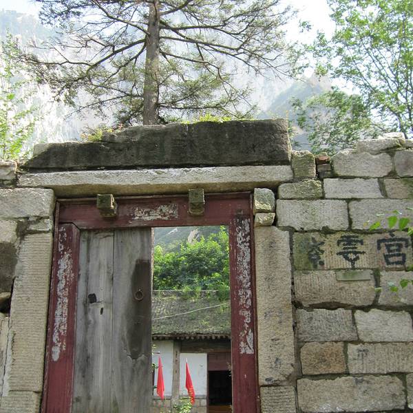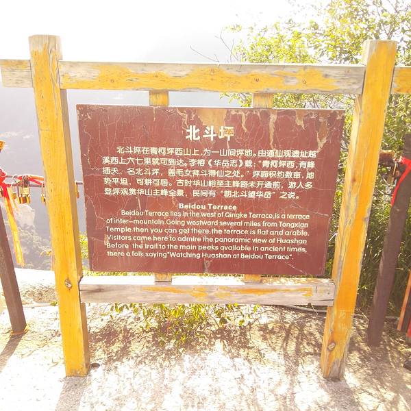 在青柯坪西山上,为一山间坪地。由通仙观遗址越溪西上六七里就可到达。李榕《华岳志》载:“青柯坪西,有峰插天,名北斗坪,盖毛女拜斗得仙之处。”坪约数亩,地势平坦,可耕可居。古时华山峪至主峰路未开通前,游人多登坪观赏华山主峰全景,民间有“朝北斗望华岳”之说。 坪上苍松参天,青竹挺翠,初入有石卷门,称总天一门。旧时门前石牌楼,铁狮一对,分立两侧,狮高数尺,生动逼真,今移至东道院。过门行数步,可见两山环抱,风景宜人,一石坊,额书“紫宸驻跸”,意为这里是紫微星官居住的地方。进石坊为竹园,上达山门,门内有龙井,其水澄澈甘甜。古时井畔有庙宇三间,供太上老君,现已废弃年久。庙四周有紫微洞、三元洞、斗姥洞、开山洞、金天洞、祖师洞等十余处,以紫微洞面积最大,称华山第一洞。坪上北峰巅有巨石,石顶平坦,人称拜斗台,相传是毛女玉姜和清时道士王常月等朝拜北斗的地方。东崖有巨石,形如卧虎,人称卧虎石。 坪上,植被良好,林木繁茂,浓荫蔽日。每逢深秋,满山红叶喷薄灿烂,如火如炽,蜿蜒小径,落叶似毡,铺彩叠锦,是观赏华山秋景的理想去处。