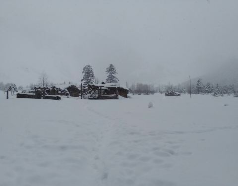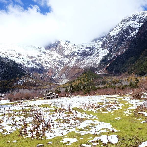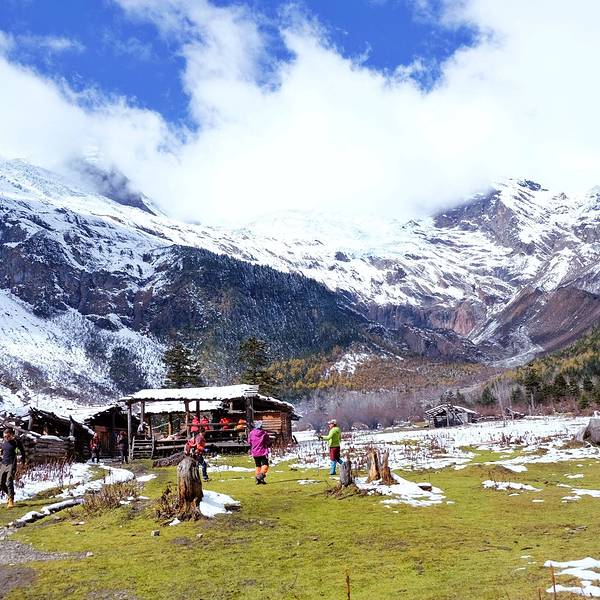 快11点的时候到山顶了,地上的雪越来越多,越来越厚了,感觉从秋天一下子到了冬天,翻过山顶眼前都是雪。下山的路比较陡,路已结冰很滑要特别小心:徒步笑农大本营徒步笑农大本营徒步笑农大本营徒步笑农大本营徒步笑农大本营徒步笑农大本营徒步笑农大本营徒步笑农大本营下了雪山,到了平地,雅梅、小吴、燕飞他们在等我们,我们吃了些东西补充体力,尝了一下阿峰的青稞饼,感觉不是真的青稞做的,像面粉做的。吃完东西后我们就一起出发了,当我们历尽千辛万苦来到一小片相对开阔的平原,看到几座破烂的木屋,有人说这就是笑农大本营时,我顿时有点傻眼了,怀疑这是大本营吗?后来看到大本营三个字,才承认我们是真的到了大本营,11点半我们到了大本营。