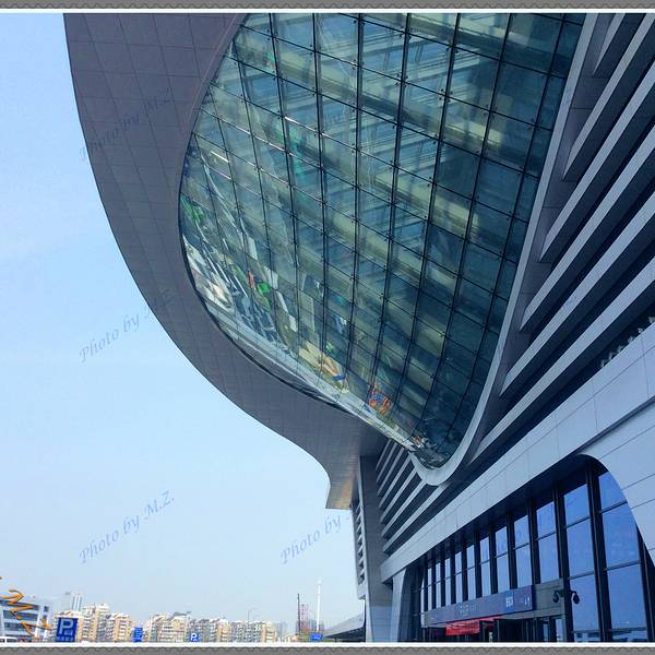 宁波站应该是坐落在宁波市区比较中间的位置了,因为它距离很多好玩的地方都不太远:比如南塘老街、月湖公园等等。第一眼看到它是晚上从机场乘大巴进城到达终点站时,大巴车就停在宁波站的南广场,我们还没下车就被它璀璨的夜景迷住了,它的外观就像一座水晶宫般的绚烂。次日,在白天看到它的全貌,依然很欣赏,这就是一座现代感极强的建筑艺术品。