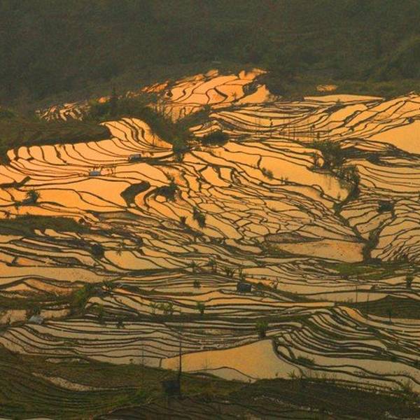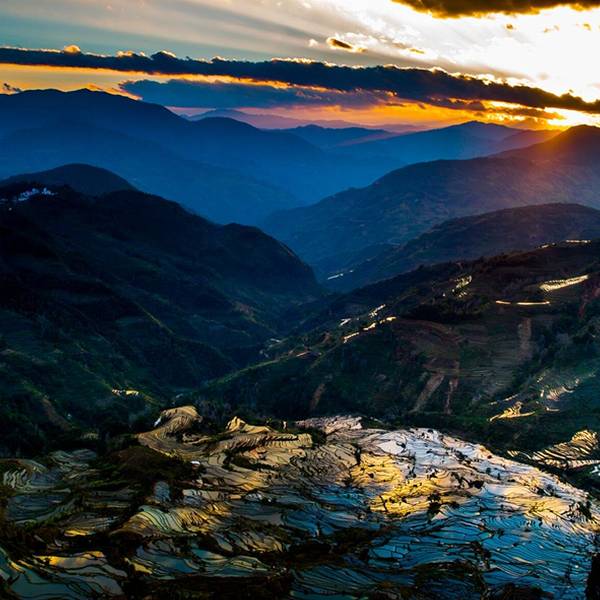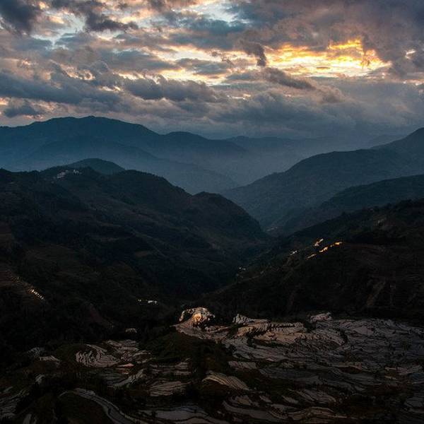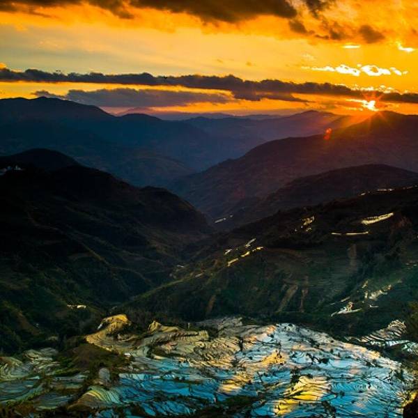 让人赞叹的不是日落之中的夕阳,而是落日下的梯田。 不过还是能看出这时的元阳梯田线条分明,错落有致【元阳梯田 之 老虎嘴景区】老虎嘴绝对是去元阳的重头戏,因为这里是拍摄元阳梯田日落的最佳地点,即使天空不作美,老虎嘴梯田的线条也会格外分明,错落有致。