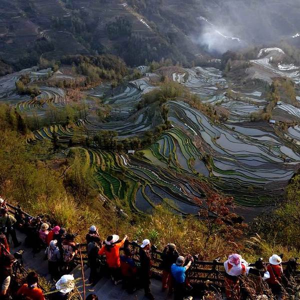 这里1—2月景色最美,春节前后经常有云海出现。老虎嘴景区观看日落最为出名,一般下午都是04:30后开始去,大概06:30日落,这段时间梯田颜色变化最多。