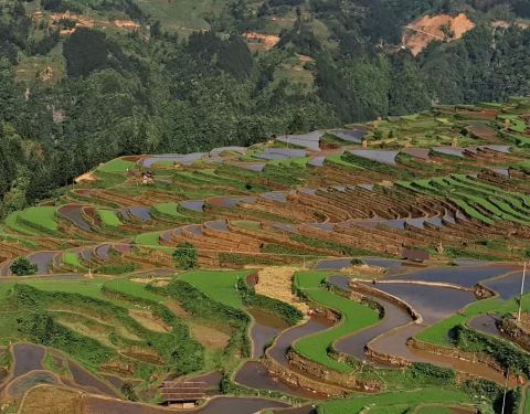 山区里气温变化很大,即使是炎热的夏天,夜间气温也会比较低,最好携带一些保暖御寒的衣物。美丽的梯田,倒映着天空,充满神奇的色彩层层梯田于山间铺展,好似一幅美丽的画卷梯田包围着原始的村寨,人与自然和谐相处人们漫步于田间,好像一些棋子,点缀其间天空中白云随意游动,与美丽的梯田交相辉映部分稻苗发出了嫩芽,美丽的绿色动人心扉 展开