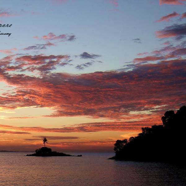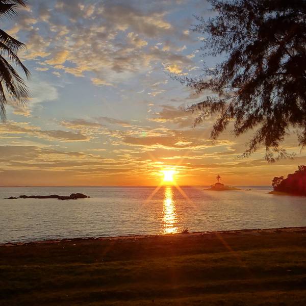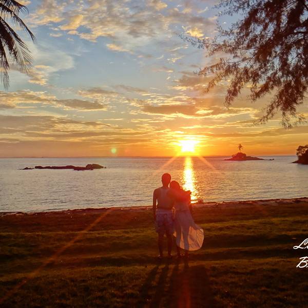 五点半,我们坐酒店的Shuttle Bus去泰餐厅吃饭(酒店的接驳车每半小时一班,为了不耽误行程,大家务必计算好时间!另外,乘坐前告诉大厅值班的小黑你想去哪儿,他会告诉你最近的一班车是几点,如果你要去餐厅他还会帮你预定餐厅的座位,等车来了司机小黑会喊这趟接驳车去哪儿,听到你想去的地方上车就好)。。为了看到日落,我们选择在室外就餐,接下来我们看到的日落景象让我们四个都震撼了!虽然这过程中我被叮了3个蚊子包,但我会说特别值得!