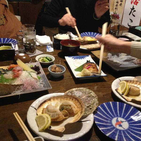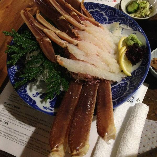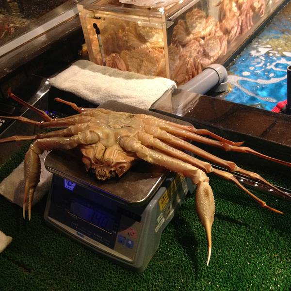 2015年春节前去函馆,一篇攻略上提到这家酒店,于是欣然前往。 海鲜的确不少,门前还供着一只巨无霸章鱼。一坐下就有中文告知书,说餐前小点费用的由来。点了只大海蟹,比最巨大的那种稍小些,2.8斤要价1W,还价到9千5,蟹腿刺身,其它烧烤,味道不错。 一顿饭下来,人均300不到一些,价格在函馆不算便宜。