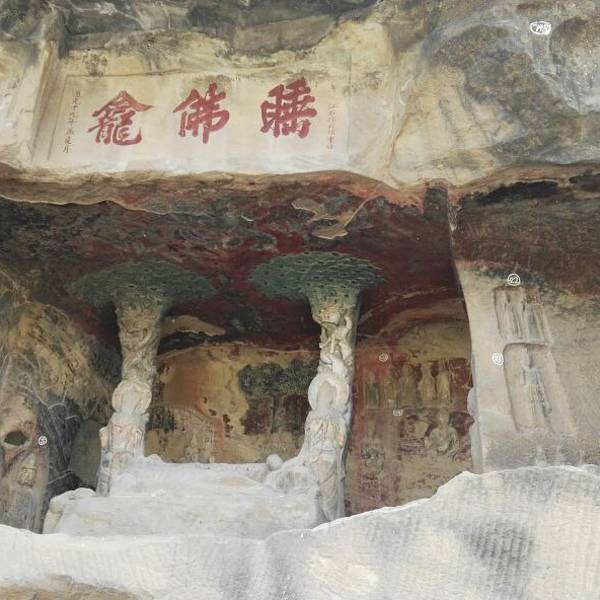 个人认为,千佛崖大大小小的众多石窟里面,其中艺术价值最高的是其中两窟的镂空石窟。简直太让人震撼了,整个造像就是从一块大石上雕出来,雕成镂空,而且图案复杂,颜色丰富。还有保存一段古驿道,景区免费的解说员说曾是皇帝走过的皇家驿道,不过记不起说的是哪位皇帝走过的了。