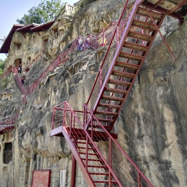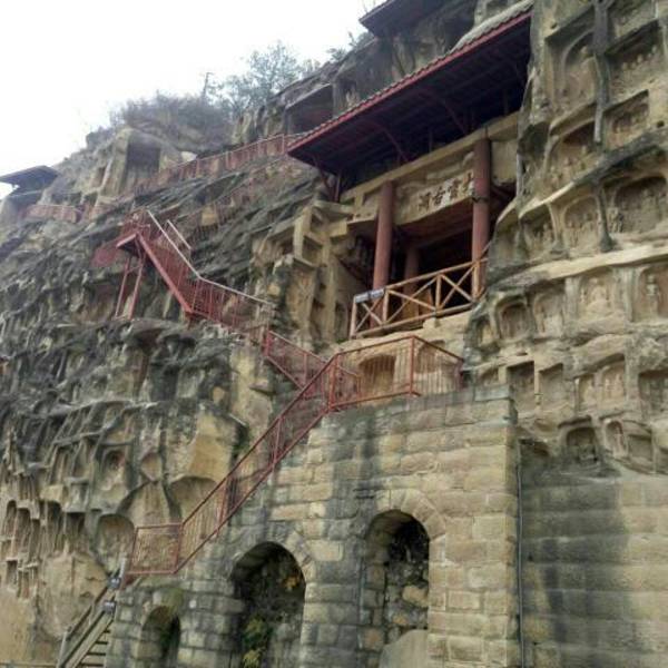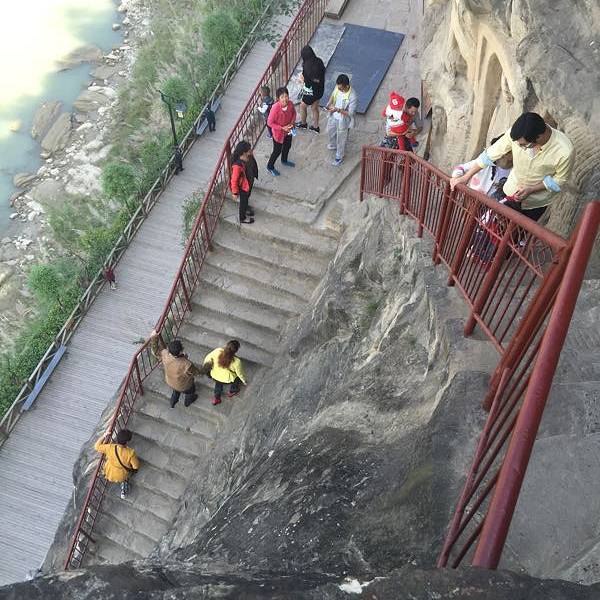 游览时除了在下面欣赏外,还可以沿观赏楼梯上来近距离欣赏。楼梯栈道很窄,行走在里面欣赏着千年石像,真如同穿越了一般。除了石窟还有古道,保留下来一段当年的路面供游人欣赏。