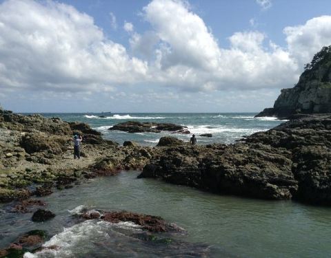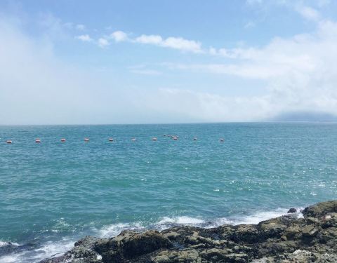 步行在悬空在悬崖绝壁上的天空步道,眺望五六岛以及海岸线。