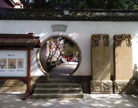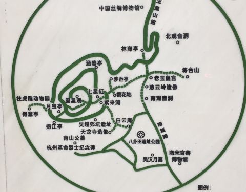 玉皇山景区位于西湖南面,山不高,海拔只有200多米,非常适合爬山休闲。山上古木参天,还有多处不同朝代的遗址古迹。另外值得一提的是半山腰处的紫来洞,单是为了看看它也值得来这里走走。景区有好几个出入口,主入口是北面中国丝绸博物馆附近的玉皇山路,两个比较常走的入口在南面的八卦田遗址公园附近,通常会从前者上山,后者下山。玉皇山路入口有一条盘山公路可以驾车上到山顶的福星观,但步行游览的体验更佳。从主入口往上爬,会先到老玉皇宫,从它面前的石阶上山,穿过盘山公路,顺着指示牌找到上山的路继续往上,不远有一个岔路。往左去到慈云岭造像和南观音洞;往右走大约15分钟就可以到紫来洞。慈云岭造像是五代时期的遗物,精美而且珍贵,这一带还保留着不少造像遗迹。紫来洞是真正的“洞天福地”,终日阴凉,特别是夏天,洞里的凉风阵阵往外透,洞口总聚集着不少纳凉的人。这里也是俯瞰山下八卦田视野好的地方,八块田地泾渭分明,四周清水环绕。洞外有个颇为幽静的茶室,在此来一杯清茶,眺望山下八卦田和钱塘远景,悠闲自在。紫来洞是景区的大看点,也是一个岔道口。从紫来洞往上,绕过七星亭,继续往上走10分钟左右就是福星观,由此可沿小路经宝月亭、得意亭下到虎跑路。或者往八卦田遗址公园方向走,这条路上会路过吴越郊坛遗址,地上是古时建筑留下的残垣,感觉很肃穆。八卦田内有农家乐可以用餐。