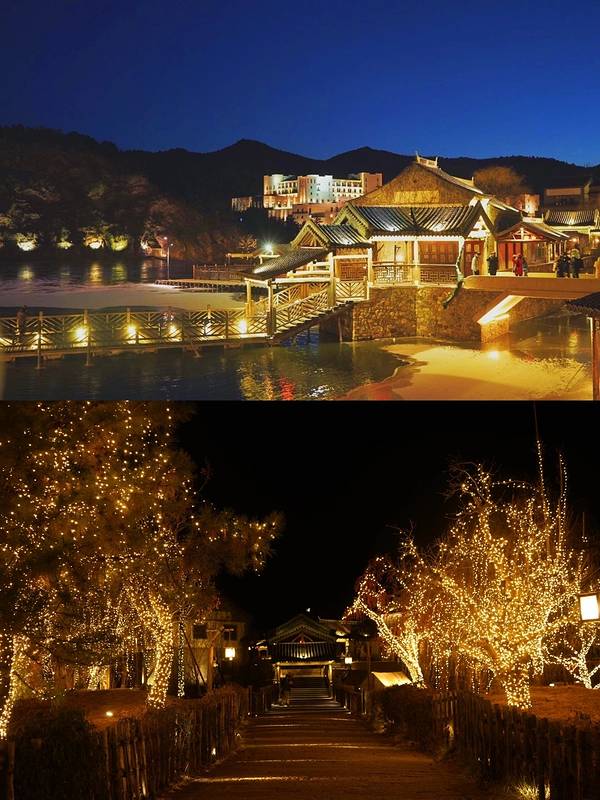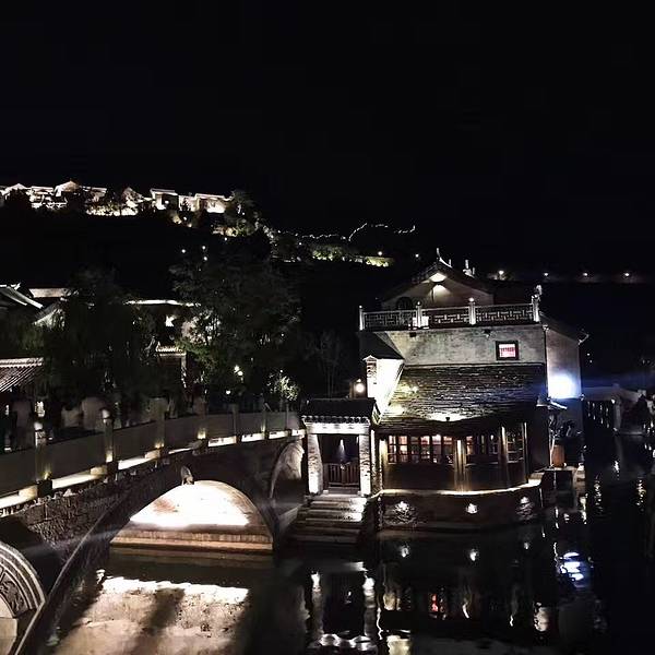 6. **夜景美轮美奂**:夜晚的古北水镇别有一番韵味,湖面上点点灯光闪烁,倒映着周围的建筑和山峦,形成一幅美丽的夜景画卷。