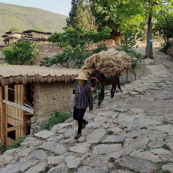 早晨9点半退房,出门右拐再右拐到兴义大道乘坐2路公交去客运西站。11点的车11点20才离开西站。13点到师宗,马上进客运站坐车去泸西。大约14点15分到泸西,在车站外吃中饭,14点45分坐乡村客运去永宁乡,大约50分钟到站,再步行大约45分钟到达城子古村。网上说可以找摩托车送过去,也许我去的时间是淡季又正值午后,没有。问了几个人,回答都是不需要吧,走过去不远。出了乡,左手边有一个挺新的村子,我以为这就是了,心想,如果这就是城子村,我扭头就回去。果然,还得往前走。城子村藏在一个大拐弯的后面,远处是看不到的,看到了是惊奇的。我在村口找到一家餐馆兼旅馆,可以吃饭住宿。虽然是公共卫生间,因为只有我一个客人,也就独享了。放下行李趁着光线正好,赶紧到处转转。依山傍水的古村既有气势又秀美温婉。这边麦子已经成熟,油菜杆也该收割,正是农忙时节。地里农民们在收获着,村里只有老年人和儿童,非常安静。有些房子已经翻盖,还好外墙仍然是黄土砖的颜色,没有破坏整体的和谐。黄昏人们赶着牛羊回来了,乡村生活气息扑面而来。如果和村民问好他们会报以微笑,小孩子更是活泼友好。我正在拍照,迎面走来三个小学生,男孩子二年级,两个女孩子一年级。见我拍照就主动打招呼,齐声喊“阿姨好!”我戴着太阳镜和遮阳帽,他们无法判断我的年纪。男孩子邀请我去他家看他的小鸡,还说他们三人都要考清华大学。男孩子自己打开家门请我进去,一点没有防范心理。我真想告诉他不能请陌生人到家里去。可是我实在不忍心撕碎他的单纯和善良,让他知道世间还有丑恶的嘴脸。古村名气不大游客不多,没有一点商业气息。城子古村和宝山石头城、诺邓古村有些类似,它更胜在村前有一片池塘,农田就在周围。都说鼓浪屿,泸沽湖适合发呆,在我看这里才是清空心情的忘忧田园。