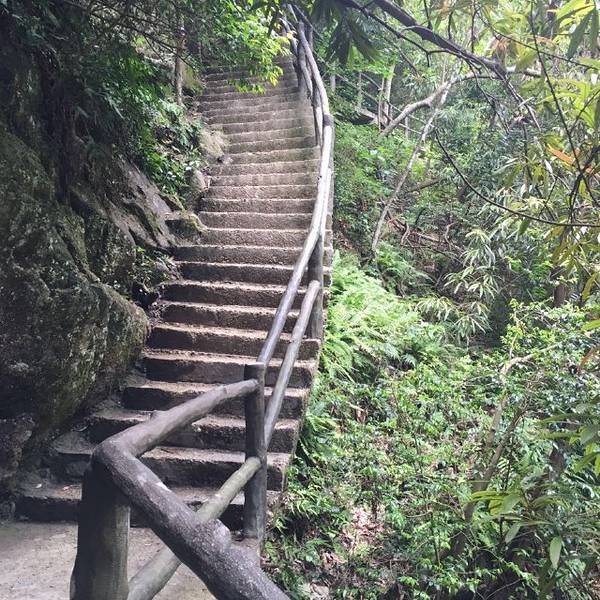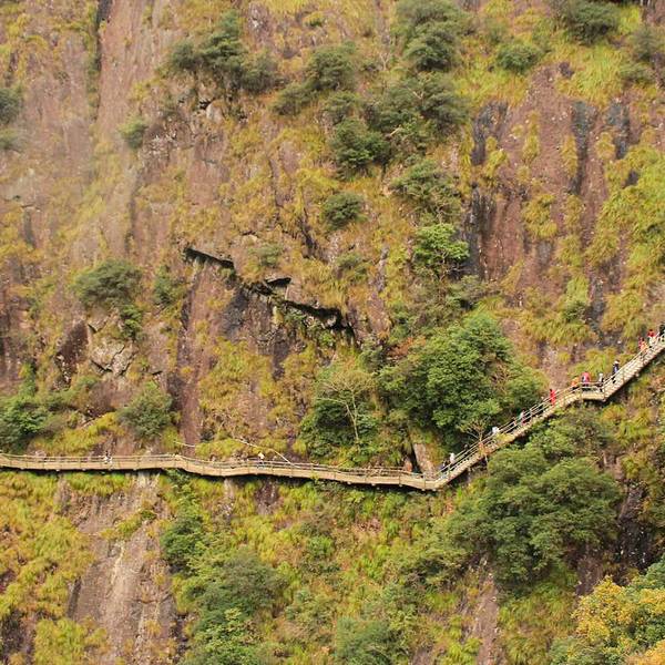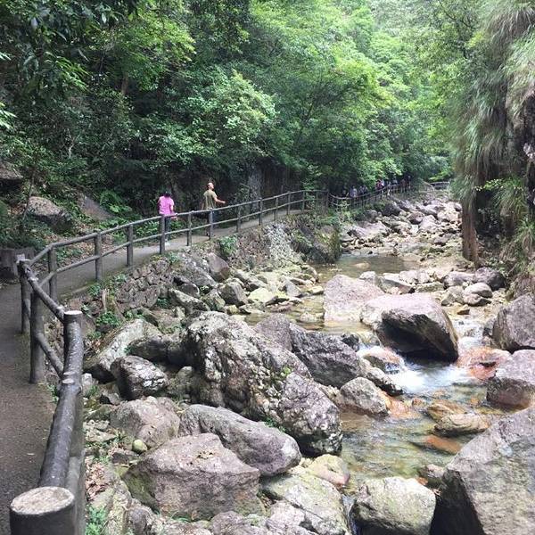 牛头山国家森林公园在武义城外60公里的地方,这个号称“江南小九寨”的地方以峭壁、溪流和碧潭见长,也算有几分姿色,不过和九寨沟比起来,还是要逊色那么一点儿。由于公共交通不便,来到牛头山的大多是自驾的游客,游人总不算太多。从大门的到核心景区大概有5公里车程,游人可自驾至山下的停车场,景区每天也有3班免费接驳车往返景区大门。停车场旁边有餐厅和山里人家酒店,靠近大门处的温泉酒店条件更好,可以泡温泉,时间充裕可考虑留宿一晚。停车场往左是通往后山望牛峰的游览道,如果是下午抵达又打算留宿,可考虑去后山走走,晚上泡个温泉,第二天再往右去到石门峡入口,爬天师峰、看天师殿、走金锁桥,也是景区主要看点。由石门峡入口过浴仙湖,到七夕桥这段基本是条直路,沿路有清亮的潭水和溪流相伴,走起来还算轻松。过七夕桥是一处岔口,左右均是通往天师峰顶和天师殿的上山路,一边上山,另一边下山即可。往左是经典惊险的游览栈道,栈道尽头是金锁桥,继续往上走过一线天便能到达山顶和天师殿了。游览栈道本身是悬在半山腰的崖壁上的,远远就能看到跨在两山崖之间长长的金锁桥和对面的天师峰,有几分大气磅礴的气势,也是拍照的美妙角度。金锁桥虽然看起来惊险,但当你走在上面便能发现其实桥还是很稳很结实的,不必太过紧张。后面的一线天也很是陡峭,不过当你爬到山顶,眼前豁然开朗的景色会让人觉得之前的辛苦都是值得的。山上的天师殿可以祈福,不过可能需要另付费。上山大约需要2小时,走起来有些累,不过下山路更平坦点,一个多小时便能回到山下的七夕桥。山上有几处厕所,但几乎没有卖东西的小店,爬山需要自备些水和干粮。靠近景区大门的神牛谷漂流(128元/人,供参考)峡深湍急,全程约3公里,算得上夏日里好玩清凉又刺激的活动项目。不过,漂流一般下午1点左右开始,建议上午爬山,下午玩漂流。