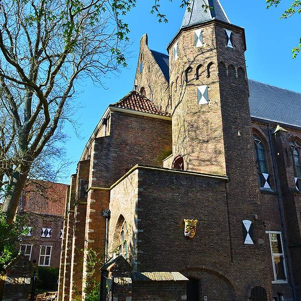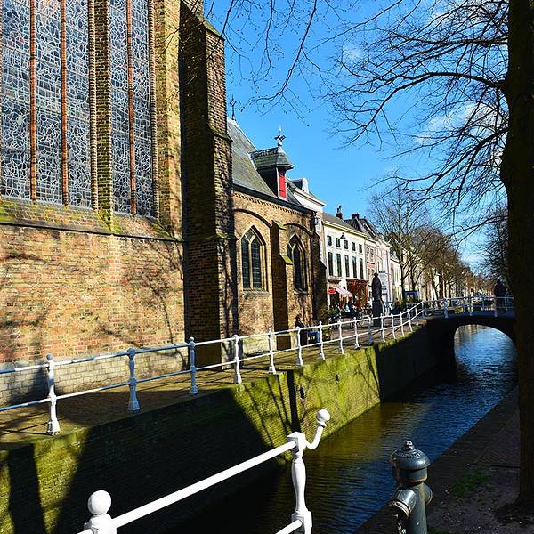 老教堂(Oude Kerk)位于代尔夫特老城,在火车站的北方,从火车站步行过来不超过10分钟的路程。老教堂建于13世纪,是一座具有超现实主义景观的建筑,建在两条运河之间,穹顶高耸,钟楼巍峨,中间哥特式的尖塔由四座尖塔护卫,四面都有大钟显示着正确的时间。
