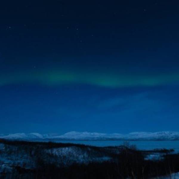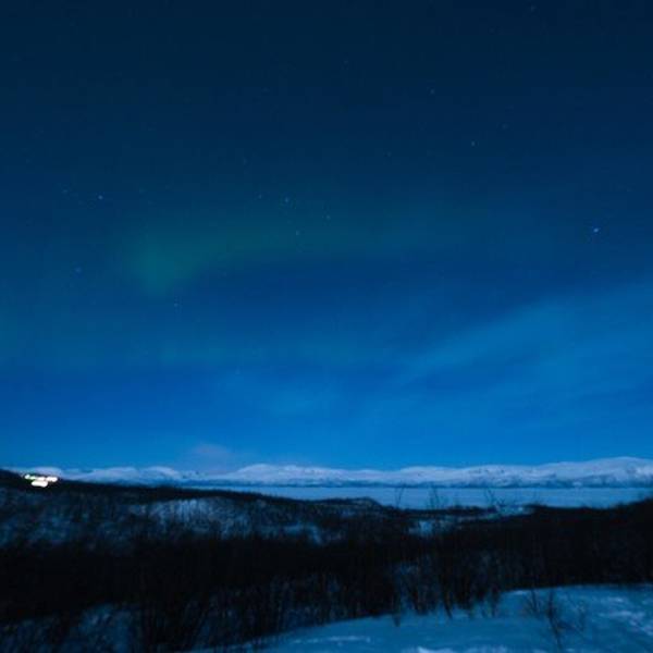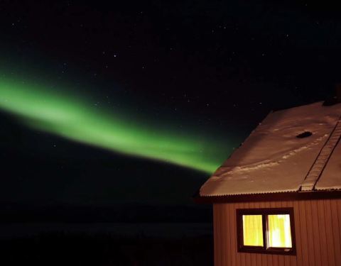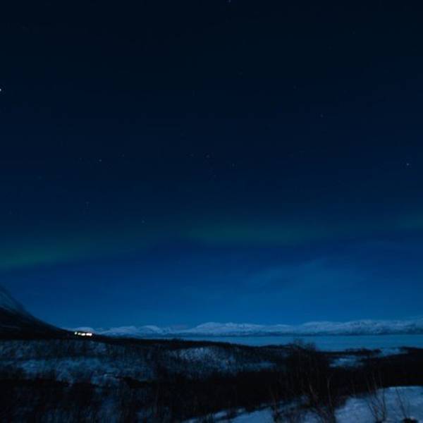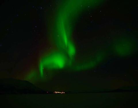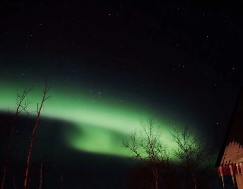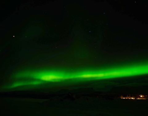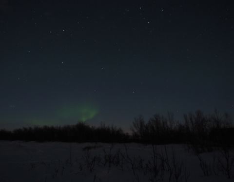 晚上我带着相机来到厨房,隔一会儿就去观察一下天空,此时天空居然放晴了,我心里一阵激动,说不定能看到第二次。快到10点的时候,天边远远地出现了一丝光亮,直觉告诉我那应该是极光,于是我把go pro放在窗台上长曝光来检验,照片里果然有一抹绿,我兴奋地招呼maria去穿衣服,可以出门等激光了!