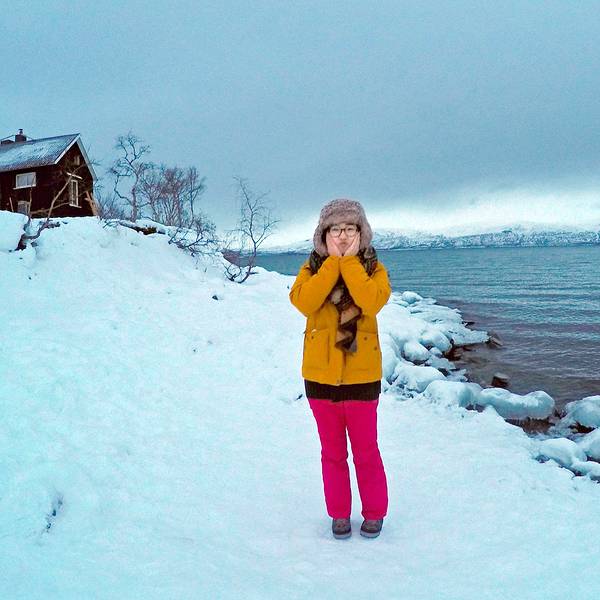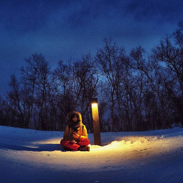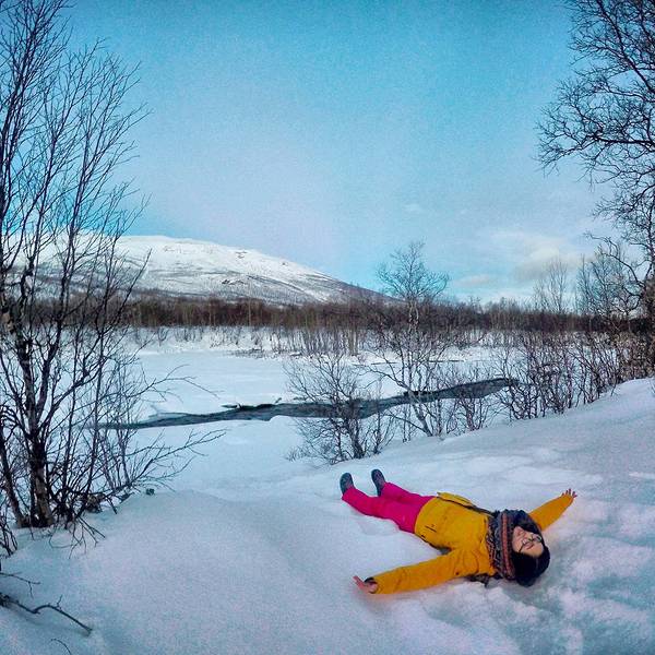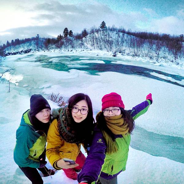 上次光顾着拍极光了都没有拍跟极光的合影,我按下快门就跳到雪地里- 白天依旧刮风下雪,猛烈的时候连对面的山都看不见,全部都是白茫茫的一片。对这样的天气我已经不抱太大希望,安然地躺在床上看起书来。