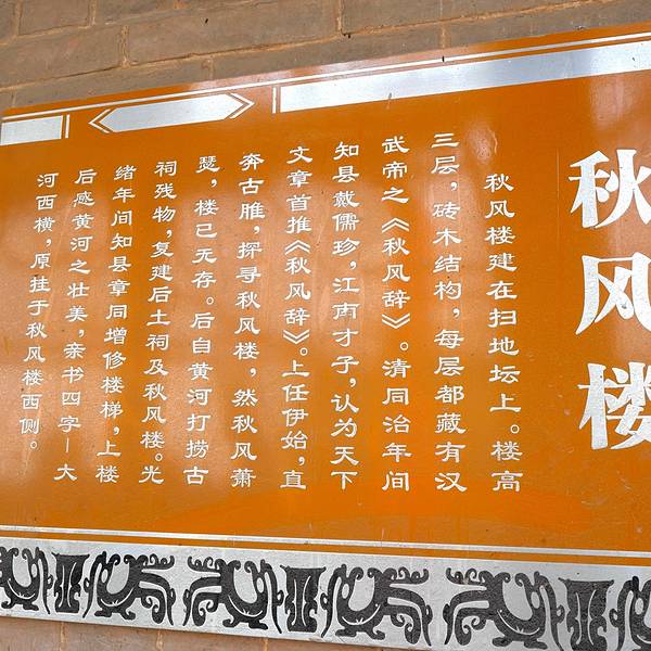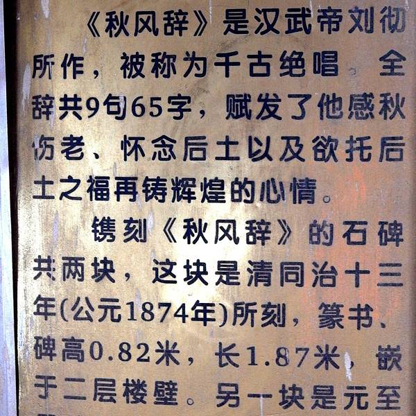 佛道儒成品字型三戏台也是国内唯一!” 所以真值得一游!兰有秀兮菊有芳,怀佳人兮不能忘后土祠有历代好几位皇帝前来祭祀,还存有宋神宗手迹萧蔷碑,明清皇帝不来是因为掬了一把后土祠的土在北京建了天坛,所以可以就近祭拜了。整个后土祠虽是清代后建,但明代的雕龙石柱 ,宋代的石刻平面图,为整个精...后土祠有历代好几位皇帝前来祭祀,还存有宋神宗手迹萧蔷碑,明清皇帝不来是因为掬了一把后土祠的土在北京建了天坛,所以可以就近祭拜了。整个后土祠虽是清代后建,但明代的雕龙石柱 ,宋代的石刻平面图,为整个精细的做工锦上添花!佛道儒成品字型三戏台也是国内唯一!更何况秋风楼是先有文章后有楼,不象其他名楼都是因为登楼而得佳文,他是因为供奉汉武大帝的秋风赋碑文而建:“秋风起兮白云飞,草木黄落兮雁南归。兰有秀兮菊有芳,怀佳人兮不能忘。泛楼船兮济汾河,横中流兮扬素波。箫鼓鸣兮发棹歌,欢乐极兮哀情多。少壮几时兮奈老何!” 所以真值得一游!相对,先去的西厢普救寺,除了爱情故事和莺莺塔,再无亮点! 展开