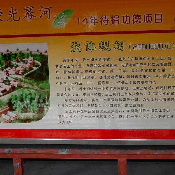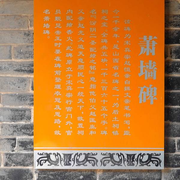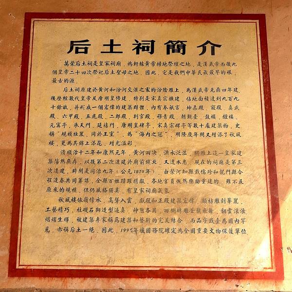 游览后土祠这样的古迹之前,最好去看一下度娘的介绍:“后土祠是中华最古老的祭祀后土女娲氏的祠庙 。后土圣母是中华最古之祖,土地最尊之神;后土祠又是海内祠庙之冠,北京天坛之源”。哈哈,直至明清开始,皇帝祭祀后土的仪式才迁徙于北京天坛的。然后再来欣赏就不是瞎看了哟。