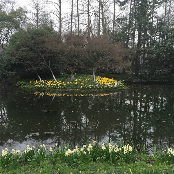 从公交车站苏堤下车,公交车站牌后面就是太子湾公园,隔街而望的则是大名鼎鼎的西湖。远远看见河水边有一条彩带,在阴沉沉的天气里更显鲜艳。水仙花盛开在水边,郁金香呈练带一般蜿蜒在绿草坪上,无奈的是,羊肠小道上挤满了拍花的人。