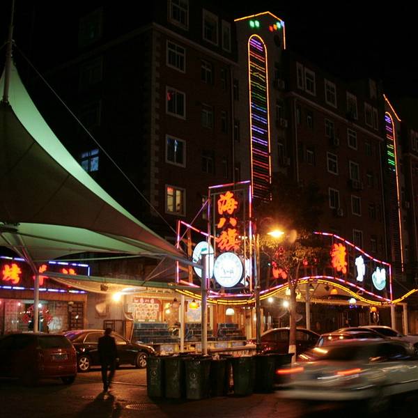 市内有公交车可到,穿过台东步行街就能看到啤酒街灯红酒绿的标志,大约晚上6点45这里就开始了,一条街上全是大排档,一家挨着一家,路边招客的很吓人,不但一直贴身跟着客人不停的招呼,甚至还有人会拽你进饭馆,...市内有公交车可到,穿过台东步行街就能看到啤酒街灯红酒绿的标志,大约晚上6点45这里就开始了,一条街上全是大排档,一家挨着一家,路边招客的很吓人,不但一直贴身跟着客人不停的招呼,甚至还有人会拽你进饭馆,真有点黑店的架势,要是单独一人真不敢来,每个饭店打出的招牌都差不多,出发前网上搜了一家据说价廉物美还童叟无欺,还是被宰了,鲍鱼小的一点点还要45元一只,螃蟹3只中等个儿就要300多,还有一只是坏的,叫来老板换了2次才给了一只明显偏小的没味道的,就是原浆很不错,其他地方喝不到,还有辣炒蛤蜊便宜也好吃,鲅鱼水饺也是青岛特色,总体价格偏高,吃一次就好,鲅鱼水饺和墨鱼水饺到渔歌船水饺吃就好,建议学青岛当地人到这里买一带原浆或黑啤就够了。