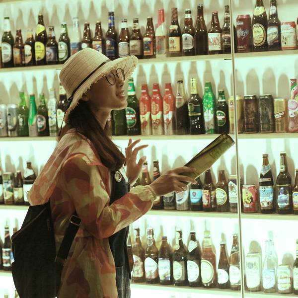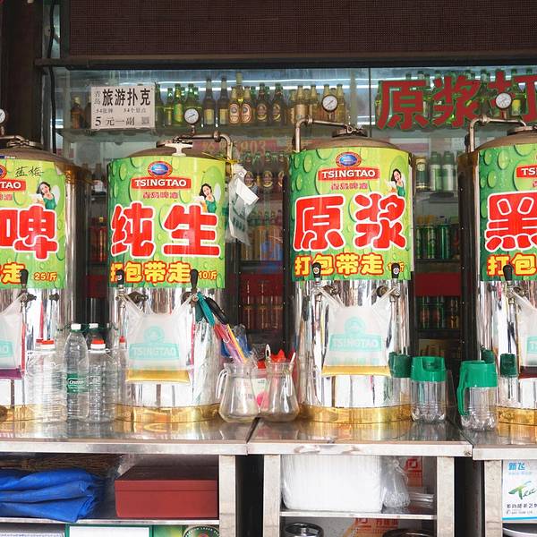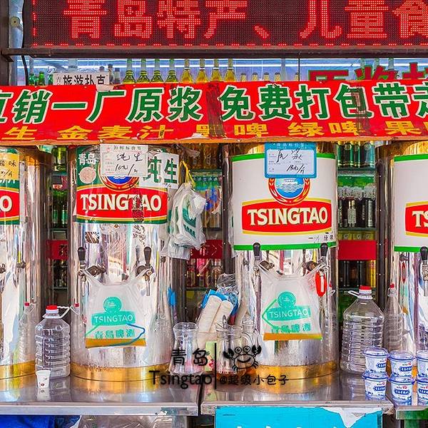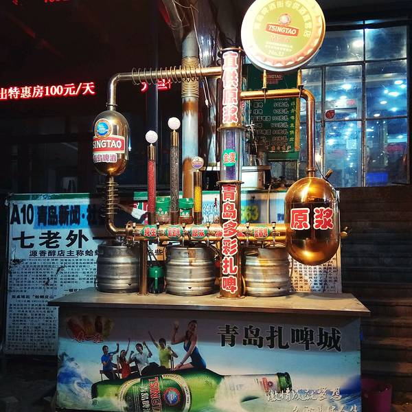 看图就知道,这里热闹的该是夜晚的时候,当霓虹灯都亮起,人声鼎沸的夜市也就开始了。一排排的海鲜大排档、酒吧,看起来都很有食欲,适合一群人的狂欢,我们也就此带过了。请用塑料袋自助装走你要的啤酒在博物馆...看图就知道,这里热闹的该是夜晚的时候,当霓虹灯都亮起,人声鼎沸的夜市也就开始了。一排排的海鲜大排档、酒吧,看起来都很有食欲,适合一群人的狂欢,我们也就此带过了。请用塑料袋自助装走你要的啤酒在博物馆门口有推销APP的人,扫二维码付50元的门票,可以进去参观并提供两杯原浆啤酒和点心,总体还行,里面挺大的,B馆可以参观到啤酒制作的流程和车间啤酒味道不错,但发现很多女生都只是为了尝一下味道,最后都是倒掉的喝完啤酒我们也就撤了,青岛机场的吃的并不多。青岛,还是值得去看一看,走一走的。