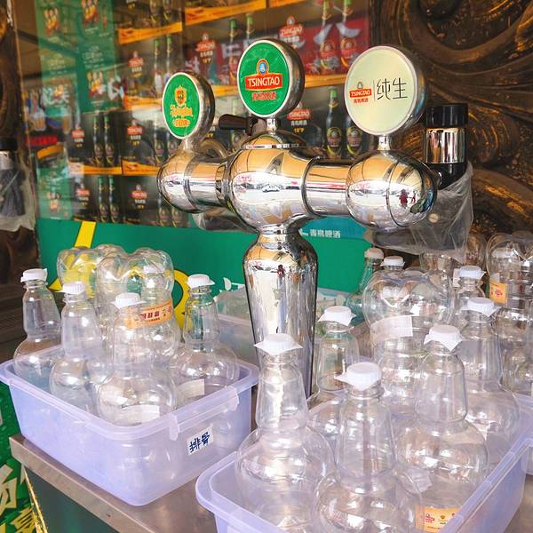 - 也见识了各种啤酒打包的工具,除了尼龙袋,还有塑料瓶,塑料桶!从啤酒厂出来,就是登州啤酒一条街啦