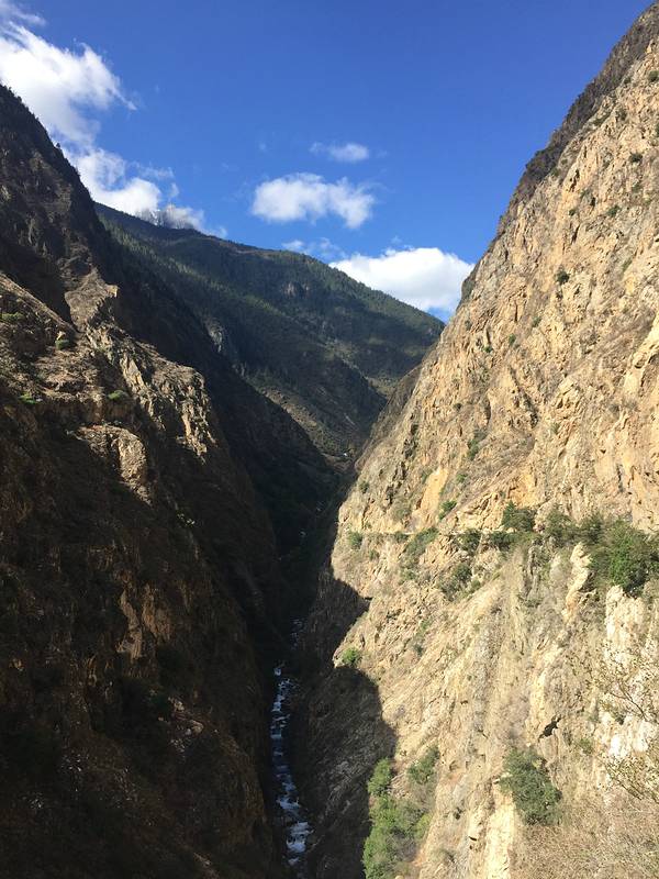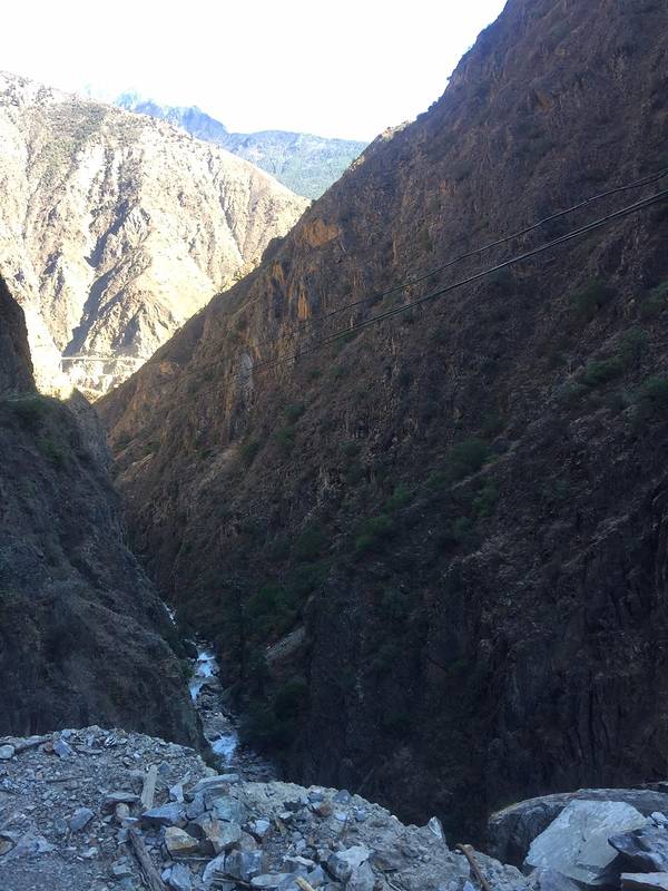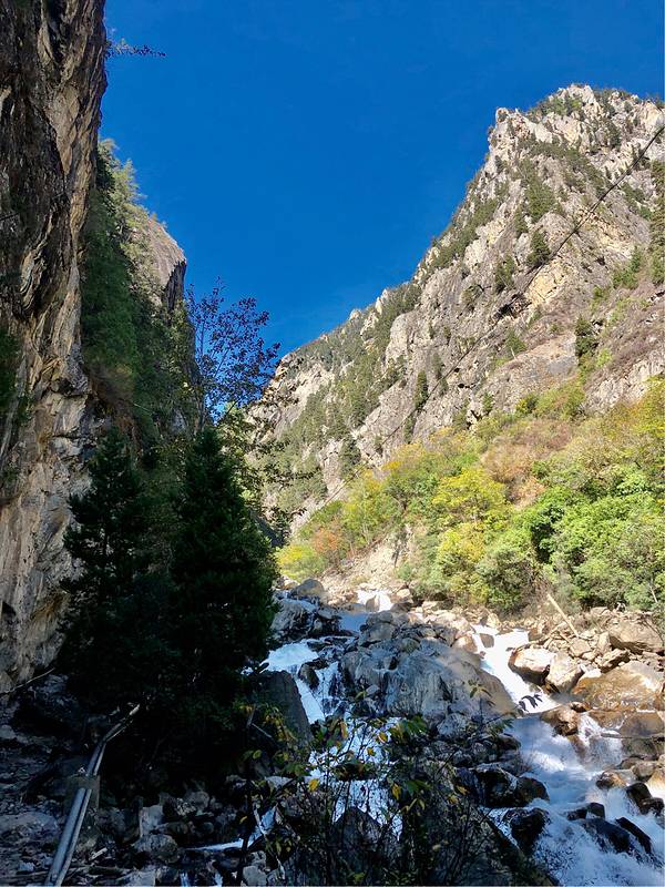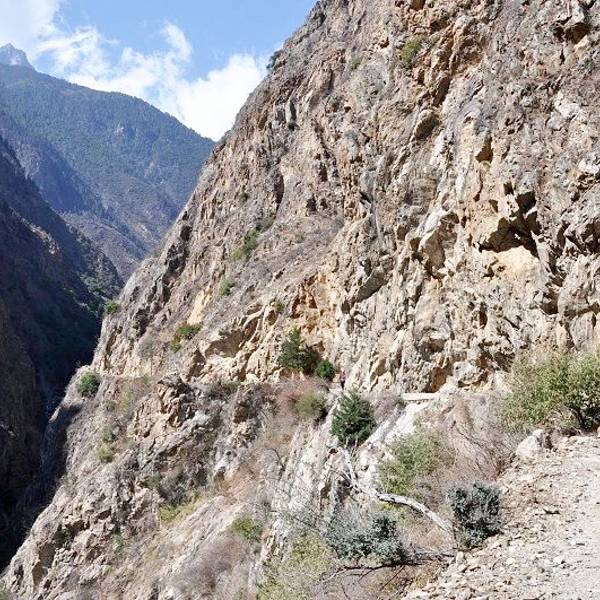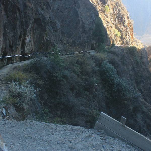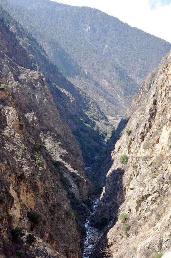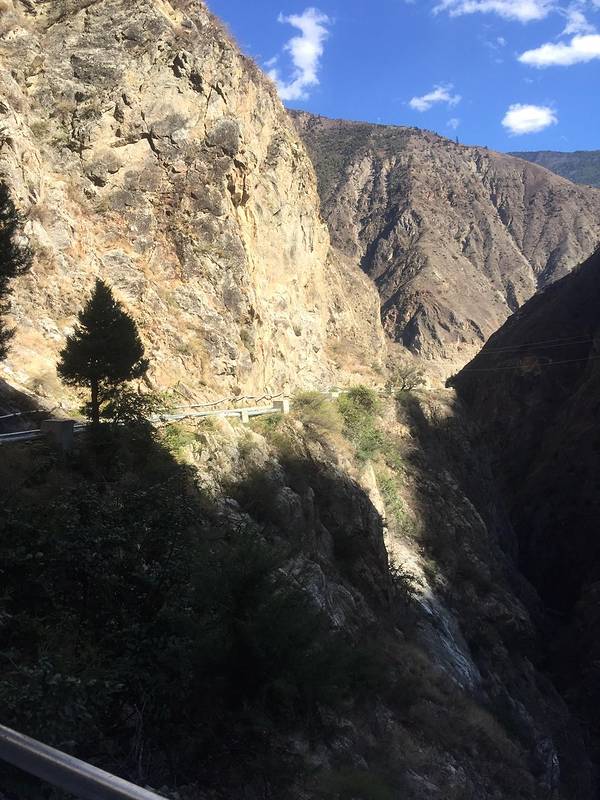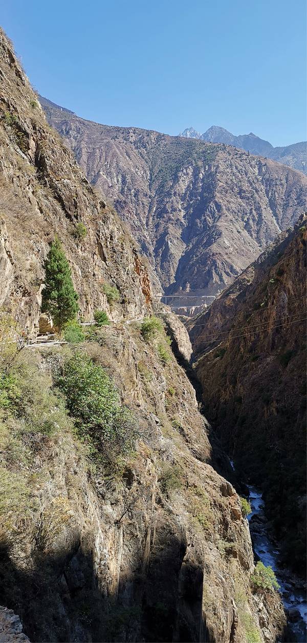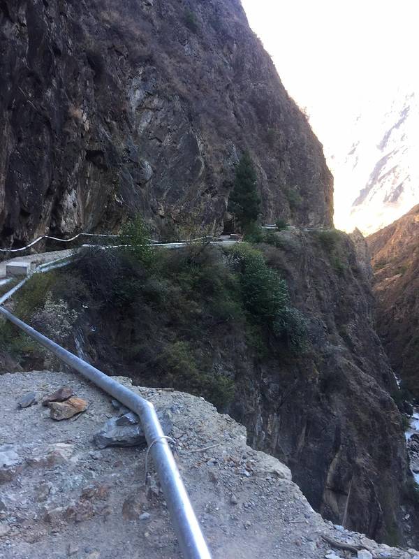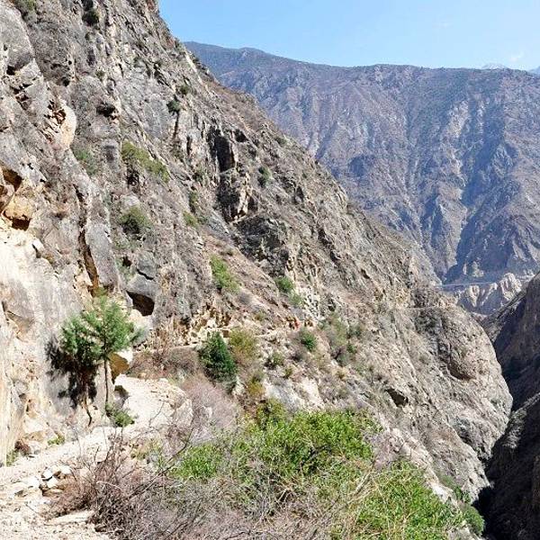 反过来想想要往上爬,我也没那么大的勇气。大段峡谷崖壁来了,右边就是绝壁上凿出的路,下面是滚滚流水……