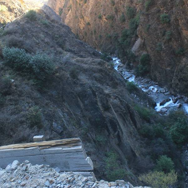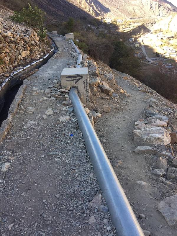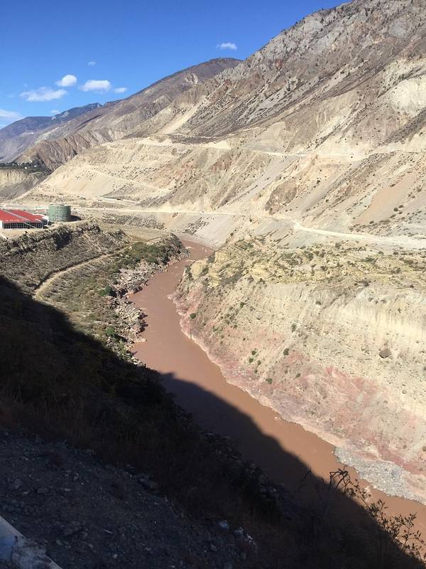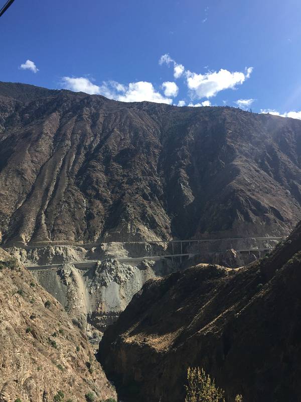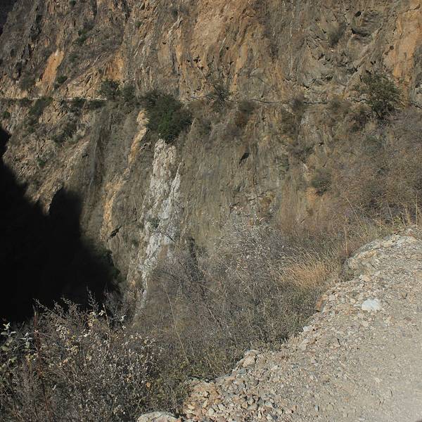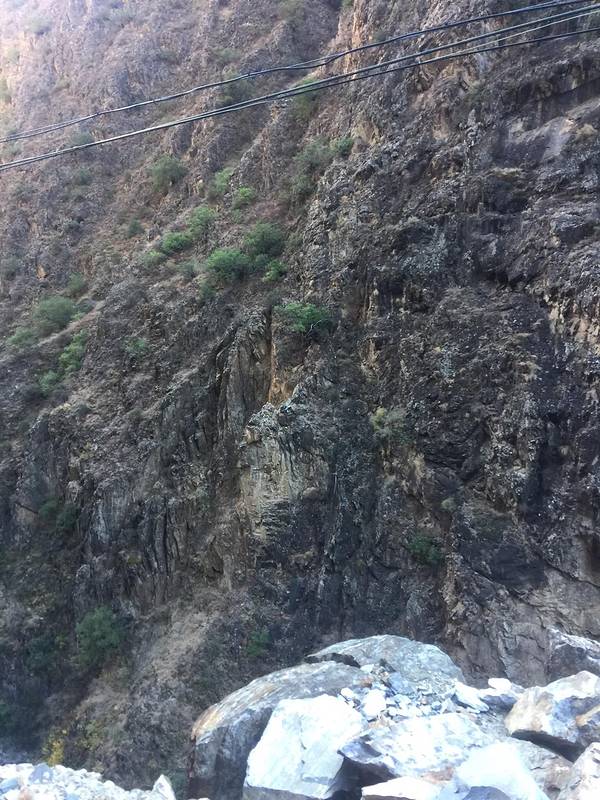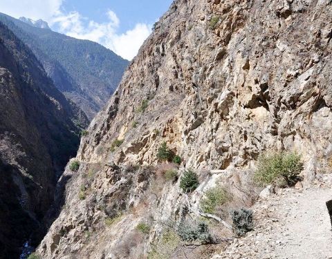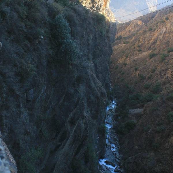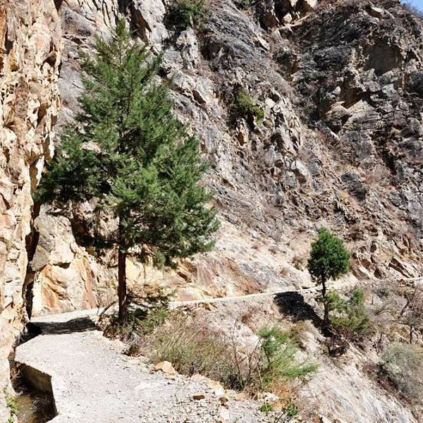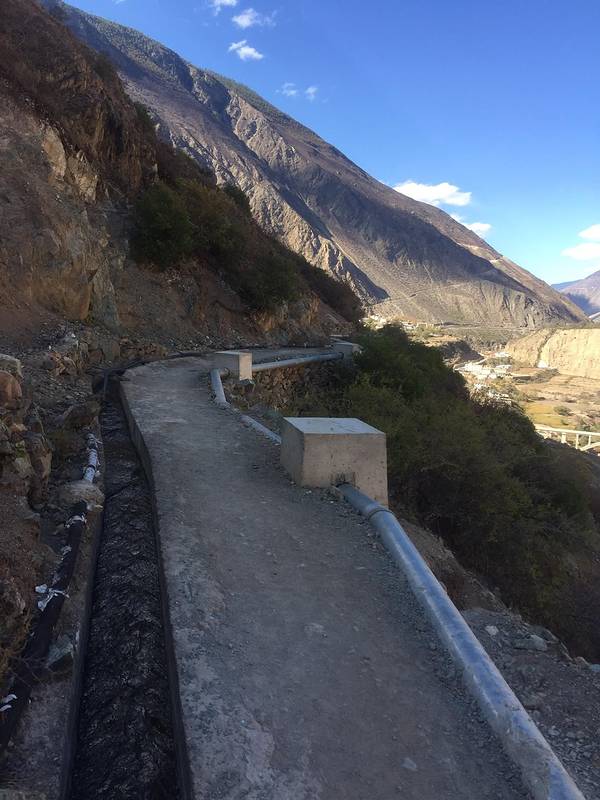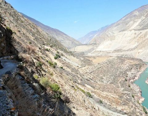 反过来想想要往上爬,我也没那么大的勇气。大段峡谷崖壁来了,右边就是绝壁上凿出的路,下面是滚滚流水……