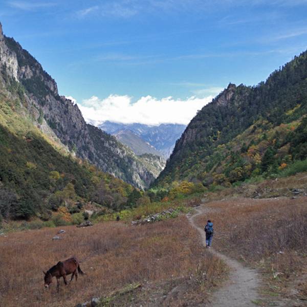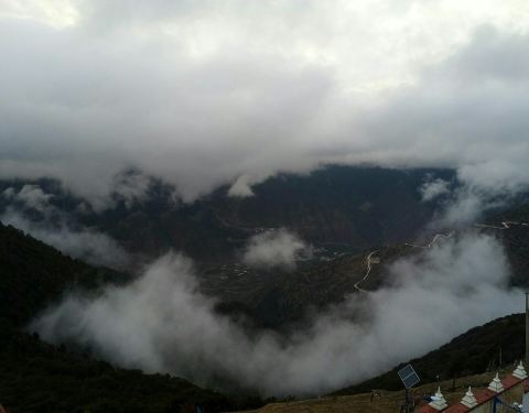 2、如果你是野驴,可以从尼农进雨崩,最好请个向导。好处是既能欣赏美景,又能免去门票。但一路上坡相当累人,这段路是西当到垭口无法比的。我们只遇到一队从尼农进雨崩的,都带着手套,手脚并用还喘得不成样子……这只是前半段路,景美路好走,转山的藏民热情和善,我们也不忘送上一句“扎西德勒”。不过要走到哪儿呢?请看云层下最远的山坳,没错,就是那儿了,望山跑死马,有木有?埋头赶路吧!之后的路是这样的,很有感觉吧?又魔戒之旅了,有木有?一路向下,海拔落差很大,路比较陡,山上的小屋算是个休息处,可以买些吃的上个厕所。