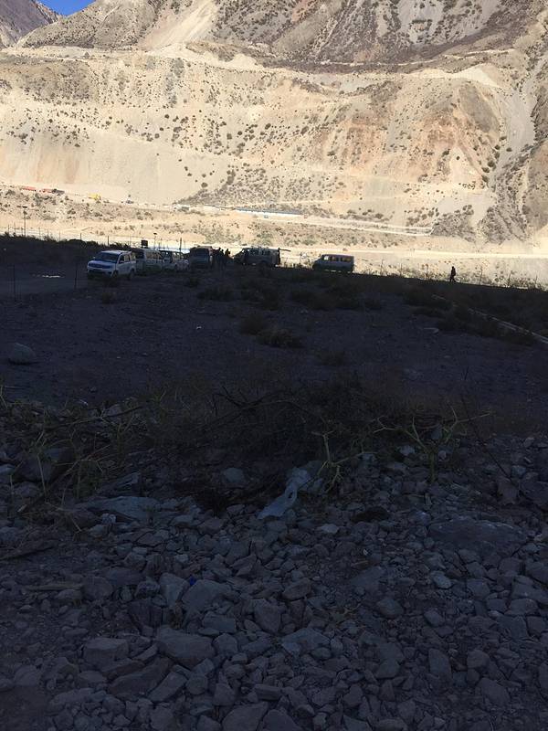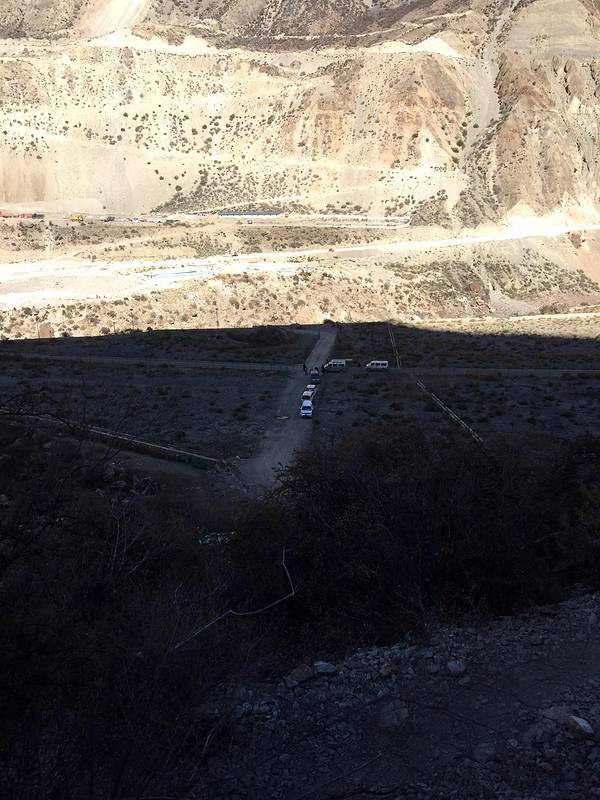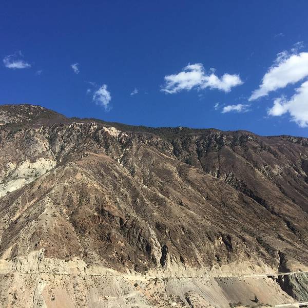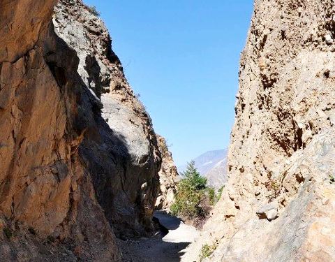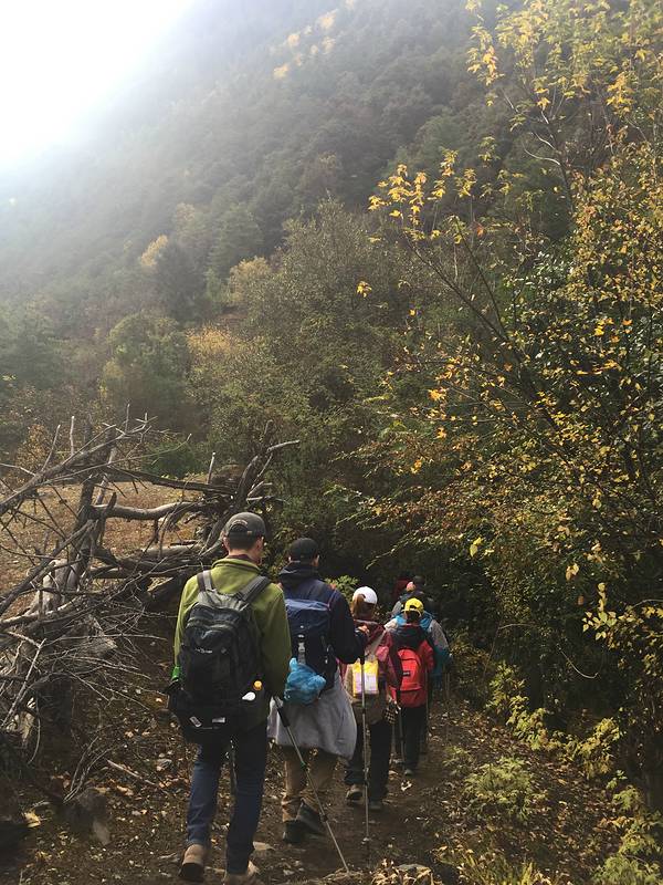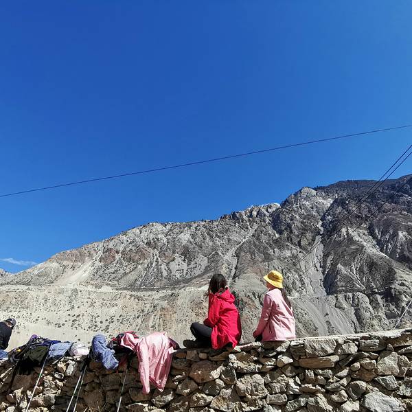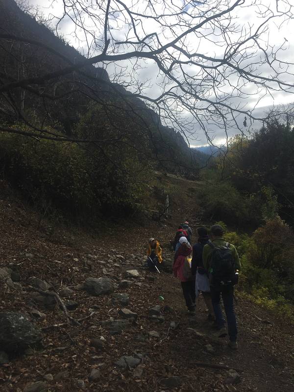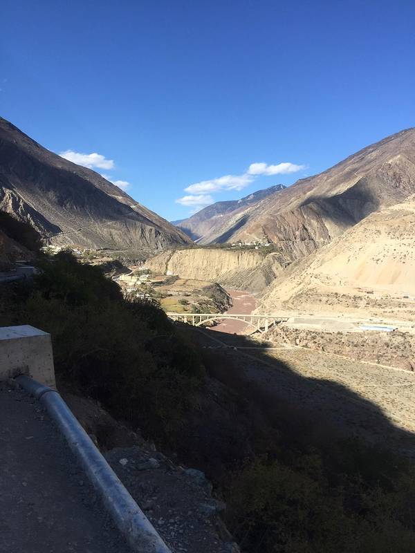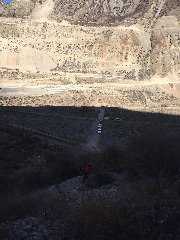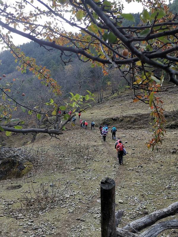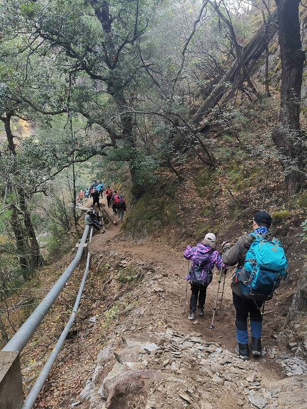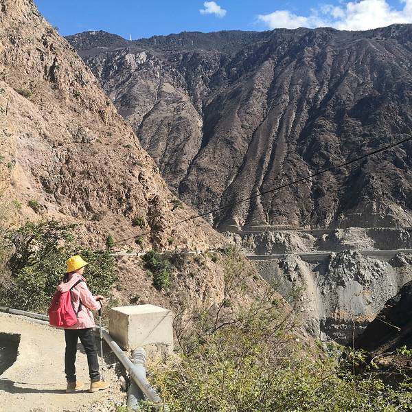 高处风大,小伙伴们都脱了帽子,有的还拄起双杖。就这么窄的路上我们还遭遇了一位赶骡子的村民,我们贴着崖壁,骡子走外侧过,于是终于明白骡子爱走外侧的原因了,那是把危险留给自己啊。眼看着对面的公路清晰可见了,咱还没走完呢,必须转弯沿着山走到村里才有桥过去……