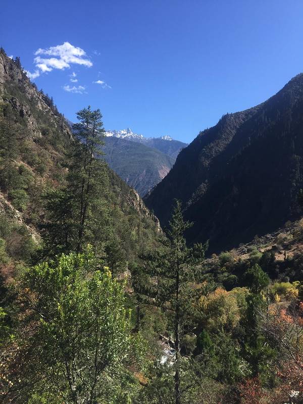 四、观景台,尼农峡谷除了令人心生恐惧的悬崖路段外,也不是迤逦风光,其中位于尼农密境客栈前的白马雪山观景台不容错过,这里对面白马雪山气势磅礴,峡谷内的植被色彩不一,景观很赞。