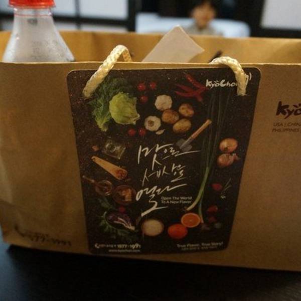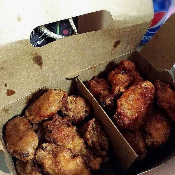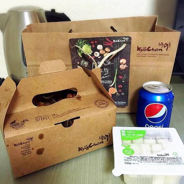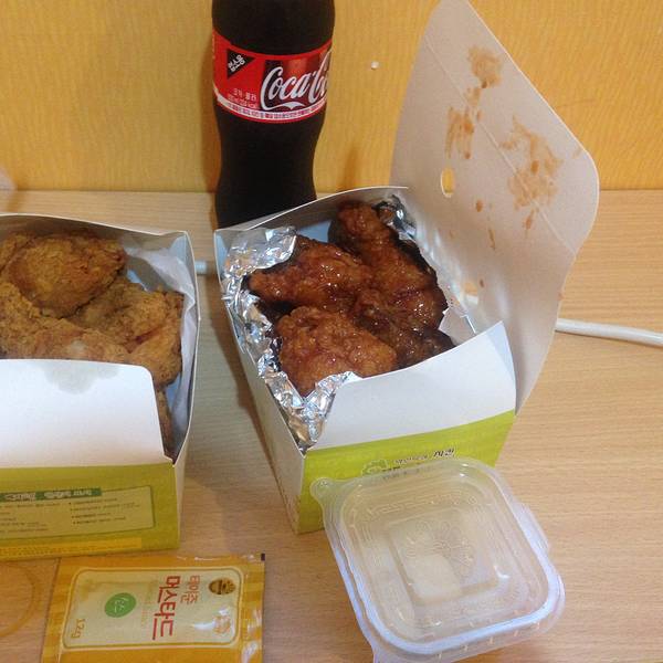 虽说校村(KyoChon)出名,但是店面不是那种华丽丽的,并没有隆重堂皇的装饰布置,只是一个很简单但很醒目的招牌,门口放着代言人长腿欧巴李!敏!镐!人像,店里的装饰也是很简单,可以看出韩国人吃炸鸡就像小吃外卖,讲求效率之余不失味道。点餐时候,服务员有中国留学生,看来中国游客是挺多的,所以不懂韩文也不用担心。因为太累了,又有点晚,所以选择外卖带走。首选原味,再加了一份辣味,送了一罐可乐,一份腌萝卜,原味需要蘸酱,不过两种口味都好好吃,而且各具特色。