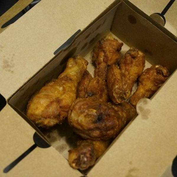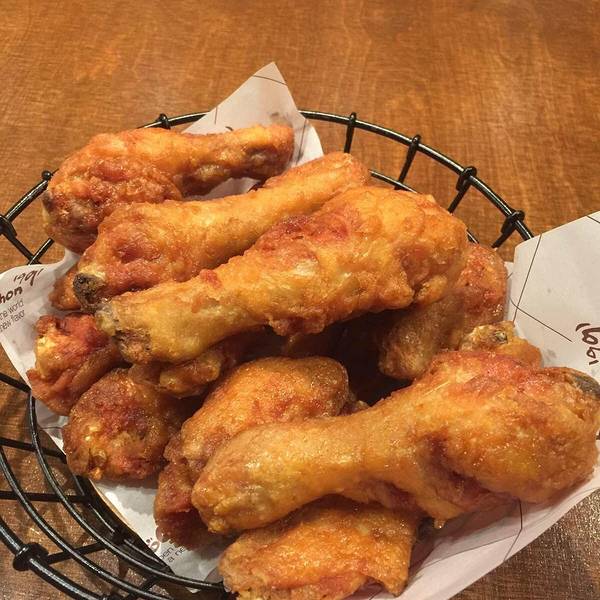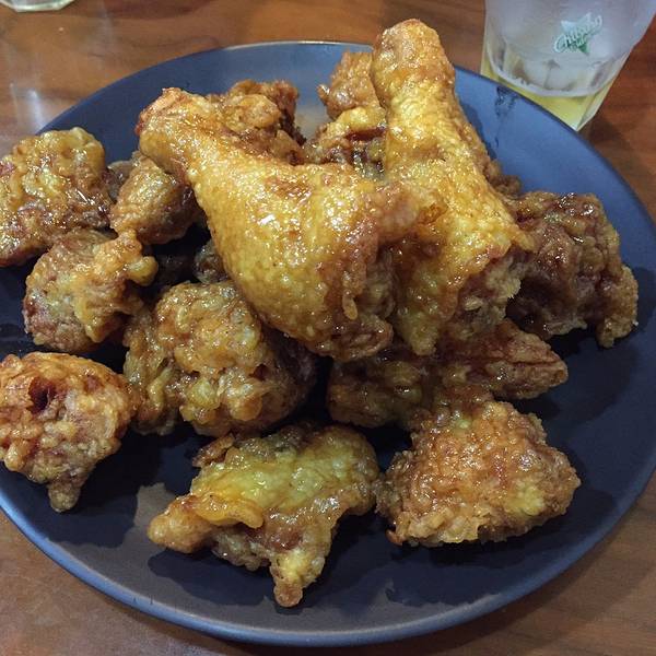 (大门,偶像做的广告)(要等很久,先喝小酒吧)(看着小,其实量很大)(味道很棒的炸鸡)