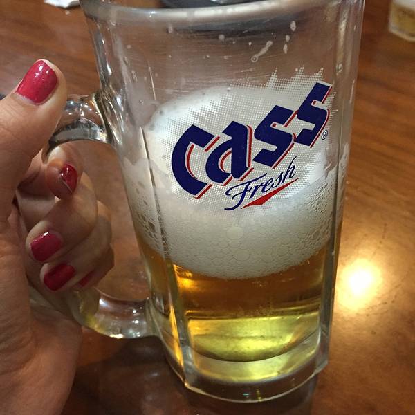 辣味炸鸡,不需要蘸酱,香辣的味道已经融入炸鸡里面,味道香辣多汁,诱人可口,个人感觉不算很辣,味道调得很好。比起原味,其实我个人更喜欢香辣味,有汁有味,另外去便利店买个韩国啤酒,搭配完美了。连续吃了两晚,欲罢不能,好希望能来广州开一家。校村消费不贵,人均也就是60元人民币,味道、性价比都很高,而且真的很填肚子。来到大韩民国,不感受一下啤酒炸鸡,白搭了。