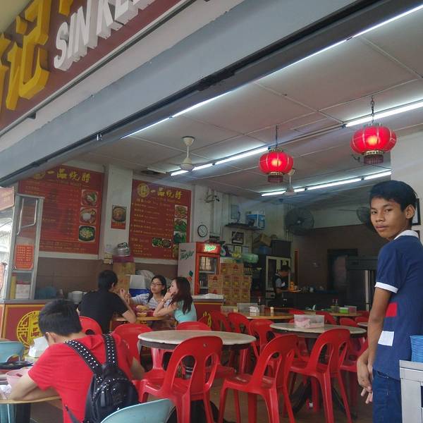 晚饭去“新记肉骨茶”吃的,肉骨茶是马来西亚和新加坡的重要美食之一,马来西亚的肉骨茶更重胡椒味。肉骨茶,简而言之就是把排骨和各种药材炖在一起,排骨吸收了药材的精华,又把药材的异味平衡了不少,于是成为...晚饭去“新记肉骨茶”吃的,肉骨茶是马来西亚和新加坡的重要美食之一,马来西亚的肉骨茶更重胡椒味。肉骨茶,简而言之就是把排骨和各种药材炖在一起,排骨吸收了药材的精华,又把药材的异味平衡了不少,于是成为一道又好吃又有益于健康的美食。亚庇的新记肉骨茶就在闹市区,想要错过也很难,因为永远都是宾客盈门。哪怕你没有任何的旅游指引书,看到哪家饭店这么热闹的样子,一定是家好饭店。还好我们去的时候不是饭点,大概下午三四点,所以能有一个室外的舒适的双人位。一看菜单,傻眼了,每样都想吃,无奈只有两个人,两个胃啊!取舍了半天,要了一份炖猪脚,一份干锅肉骨茶。猪脚非常软糯入味,写点评的时候看着图片又流口水了。猪皮很Q很弹,皮下面的肉也酥软多汁,完全没有猪肉的土腥味,满口馨香,又不肥不腻,吃完一口下去好像皮肤顿时也Q弹起来了哈哈。肉骨茶有干锅和汤锅两种,我们点的是干锅型。干锅的肉骨茶酱香很浓郁,放了洋葱、大蒜、香葱等提味,真是好吃地不得了。汤锅的肉骨茶就比较清淡,注重药材的原味,白白的那种。大师傅在很认真地制作每一碗美食,看到那些肉丸子、牛杂,真的都好想吃啊!他家除了堂吃,看到还有成包可以买回家自己做的肉骨茶调料,还有一些其它特产比如猫山王榴莲,服务很热情,啤酒也有,有机会一定还要再去吃。