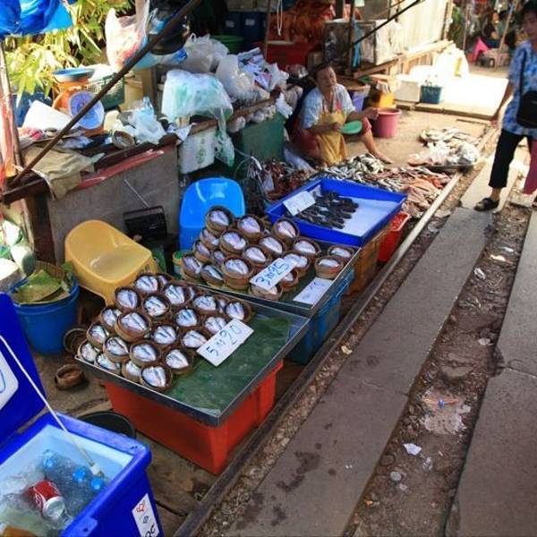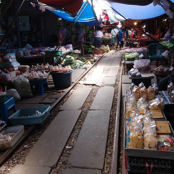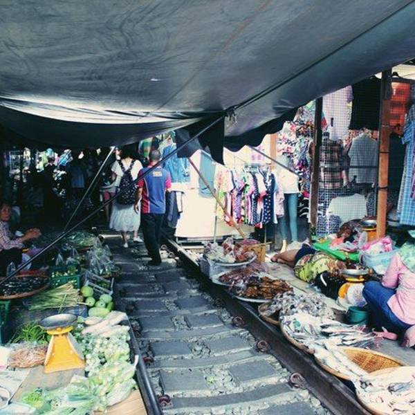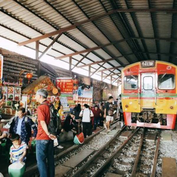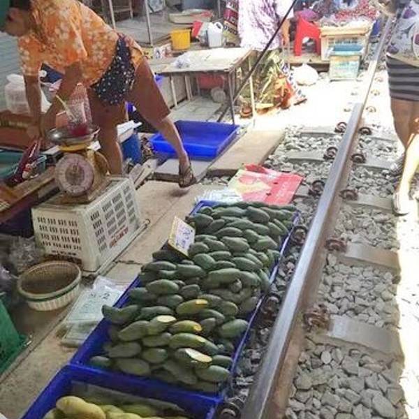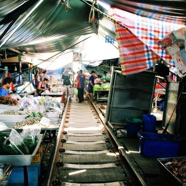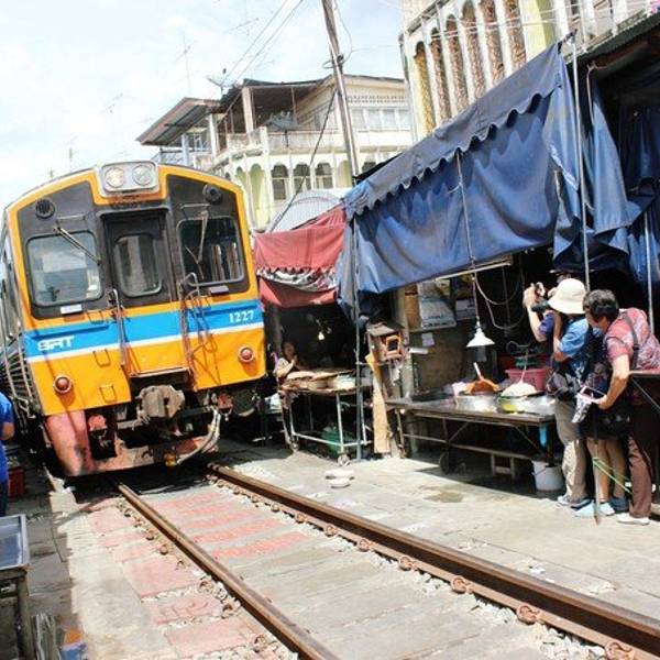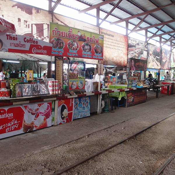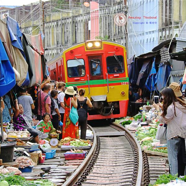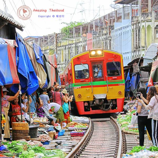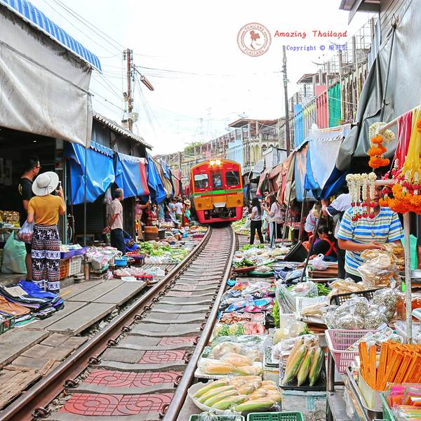 场面十分惊险,见过电影或者纪录片播过这个惊险一幕的游客都会选择在这里看一看,随着时间的推移,这...曼谷美功铁道市场,经常能够在电影上看到的市场。每当火车需要经过时,两旁的商贩就会提前收好各自的摊位,让火车顺利通过。当火车呼啸而过时,他们就贴着火车站立在两旁,感觉火车就要压过他们的菜摊子,当火车...曼谷美功铁道市场,经常能够在电影上看到的市场。每当火车需要经过时,两旁的商贩就会提前收好各自的摊位,让火车顺利通过。当火车呼啸而过时,他们就贴着火车站立在两旁,感觉火车就要压过他们的菜摊子,当火车通过后,又会让市场恢复成原来的样子。可以说美功铁道市场是个“非常危险的市场”。其实美功铁道市场是一个很普通的小市场,这里以前仅仅只是供四周的居民购买每天所需的食材。由于美功火车站往曼谷方向去的火车会穿过的这个宽度不足2、3米的菜市场,场面十分惊险,见过电影或者纪录片播过这个惊险一幕的游客都会选择在这里看一看,随着时间的推移,这里也就成为了一个景点。【交通】如果从曼谷出发的话,可以在曼谷坐小巴,先选择轻轨到胜利纪念碑站,在2号出口下楼梯后,往回大约走20来米,看到Suzuki大楼旁的巷子右转进去买前往美功的票,单程每人约70泰铢,发车时间星期一到星期四上午五点半到晚上十点半,星期五到星期日早上五点半到晚上九点半,全程车程大约一个半小时。到了美功火车站就可以步行前往美功铁道市场了,美功铁道市场就在美功火车站旁边,其实美功铁道市场就是一个小型的菜市场。【观看时间】没有火车经过时,美功铁道市场就是一个很普通的菜市场,摊位摆满铁轨,当火车经过时才有惊险一幕。由于是一个小地方,所以车次很少,如果错过了就要等到第二天了。每天经过美功的火车有四趟:上午八点、上午十点、中午十二点十分、下午两点半,最好提前到达铁道市场,毕竟火车早晚点说不定。 展开