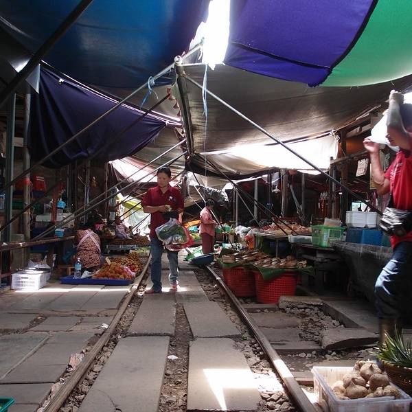世界上最危险“的市场-美功铁道市场也是泰国非常著名的一个景点,以前在电影中有看到过这个镜头,火车在菜市场中穿梭,当火车来时,两旁的商铺连忙手气支起来的遮阳蓬伞,当火车来之时,会听到车站广播一直在播放火车要进站的信息,虽然看似非常危险,但是这些商户似乎已经习以为常,当火车经过,又放下收起来的遮阳伞,继续做着生意,第一次见到这样如此有趣的场面。