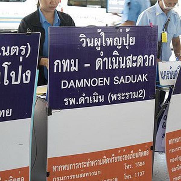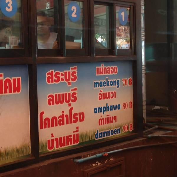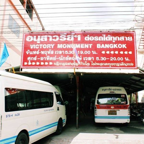 乘BTS至【胜利纪念碑站( Victory Monument )】,在2号出口下楼梯后,回转往回走约20公尺,从Suzuki大楼旁的巷子右转进去买前往美功( Maeklong )的车票(单程每人约70泰铢)。