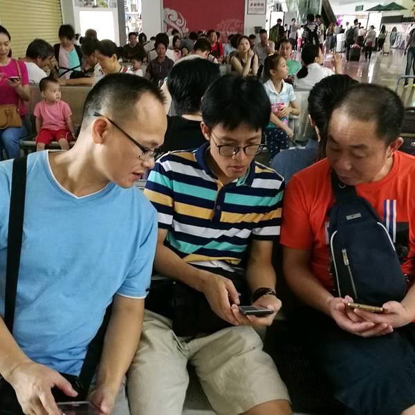 候车时玩拍照三个男人不知在忙啥