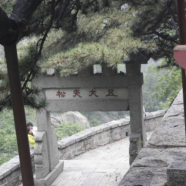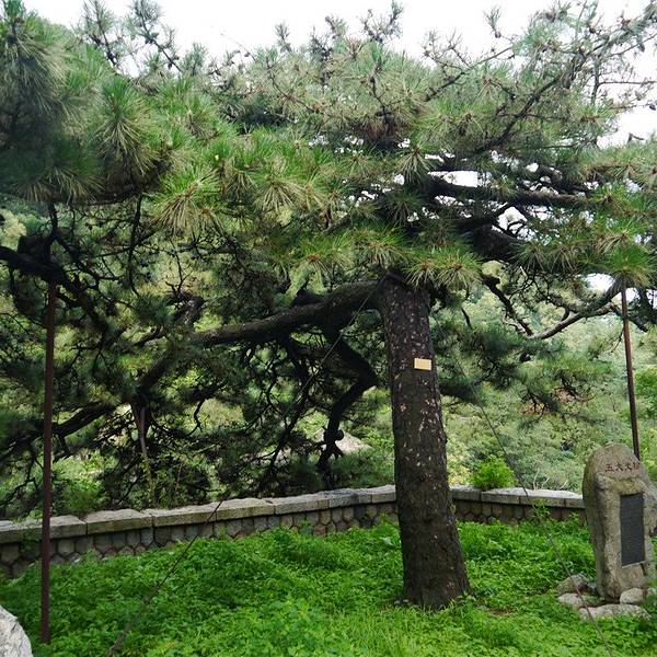 据《史记》记载,秦始皇登封泰山,中途遇雨,避于一棵大树之下,因大树护驾有功,遂封该树为“五大夫”爵位。 明代万历年间,古松被雷雨所毁。清雍正年间,钦差丁皂保奉敕重修泰山时,补植五株松树,现存二株,虬...