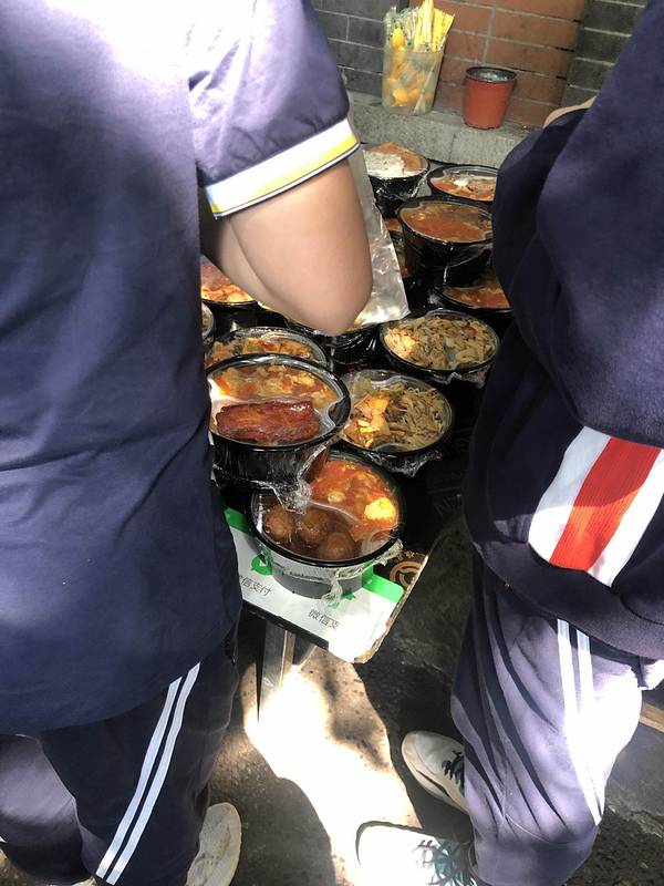 我觉得这所学校是不是孩子都很有钱。居然有711也在这巷子!巷子里也有其他地方过来的餐饮店,仅设立个卖午饭的临时站点。买的孩子很多。然后是这一家套餐饭!生意特别火爆。我探头去看了下,真的很有食欲!