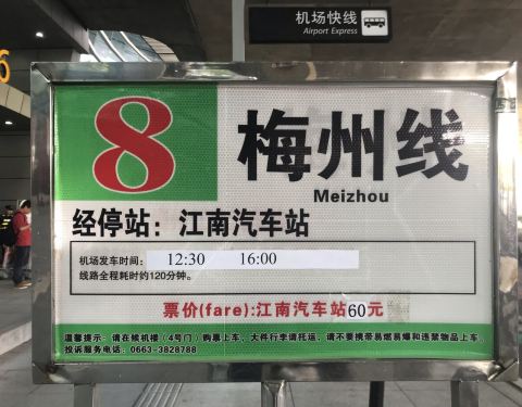 梅州线是揭阳潮汕机场往返梅州市区的快线,终点站为梅州粤运江南汽车站(梅州市梅江区彬芳大道38号)。
