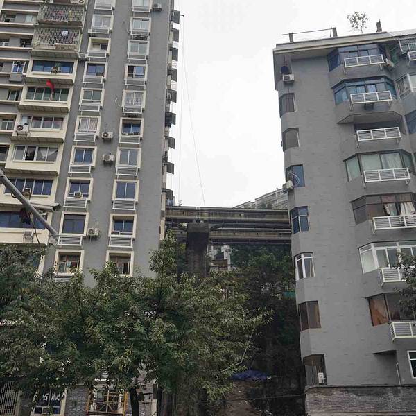 (下图就是在站在轻轨站拍的)途中2号线还经过 重庆 比较出名的“穿楼站”——“李子坝”站,确实很有意思,站就建在一栋居民楼里,为了拍到轻轨穿楼而过的镜头,我们还专门出站走远了拍照。