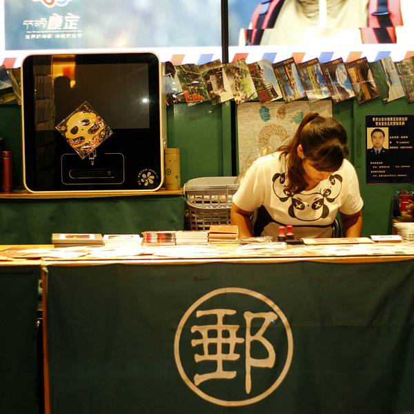 见山书院旁的旅人邮亭里,明信片的式样非常多,极具四川特色。选好明信片,盖上印章,投递到这里的邮筒中,…
