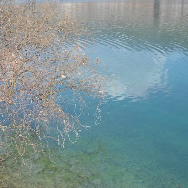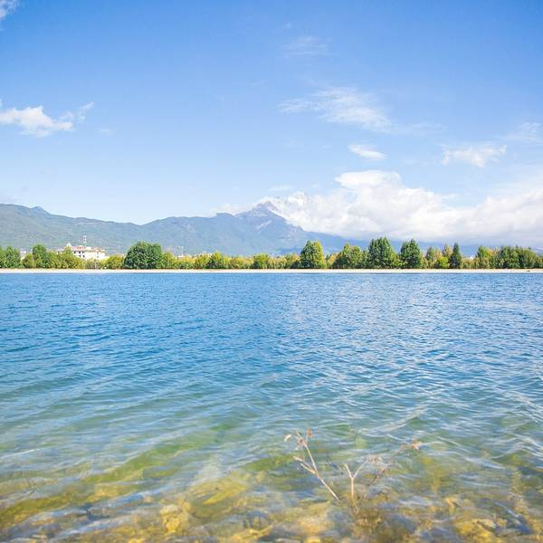 水很清澈,可以坐在岸边晒晒太阳,远望雪山,景色宜人